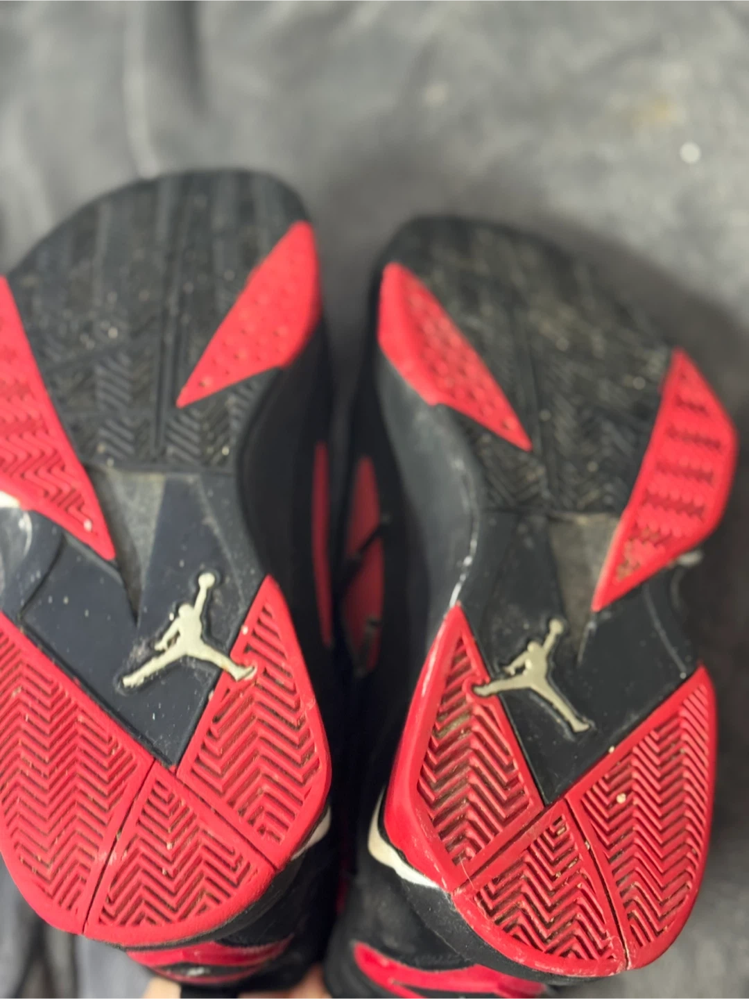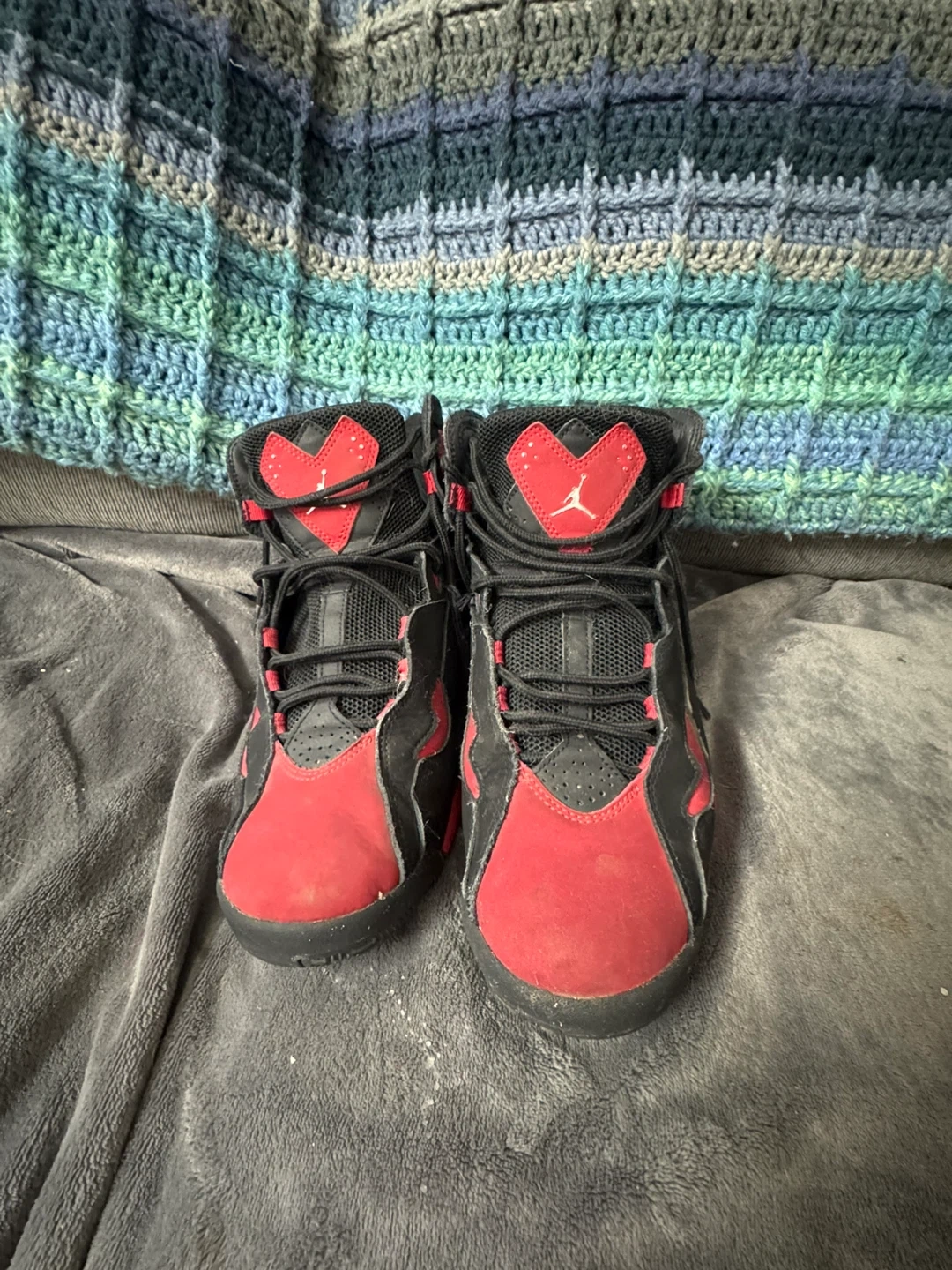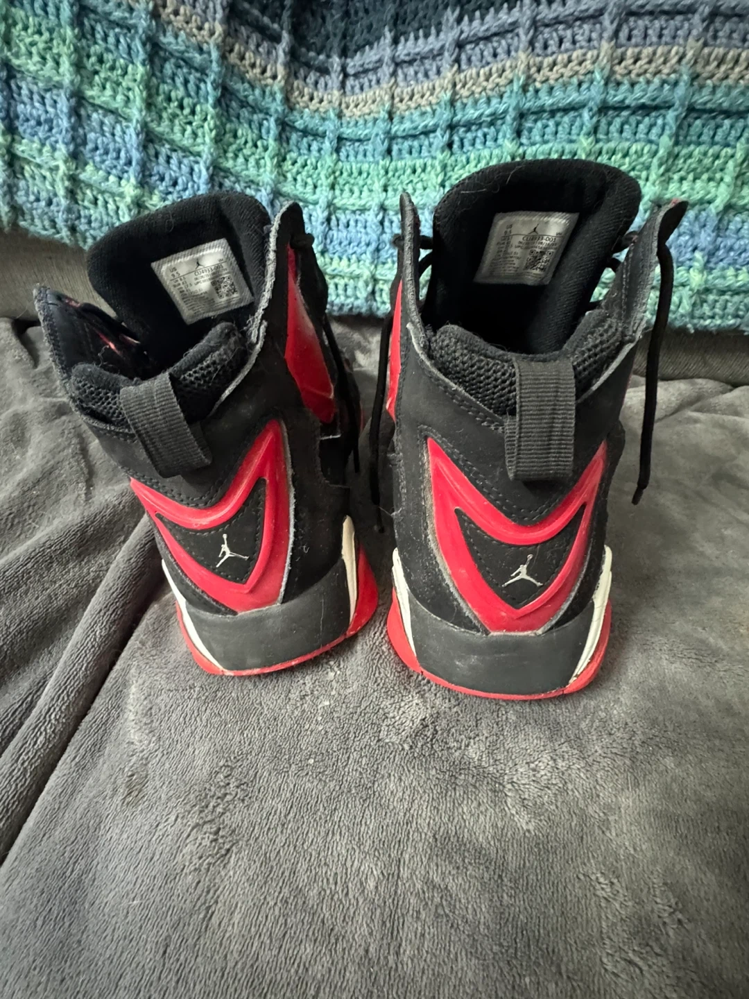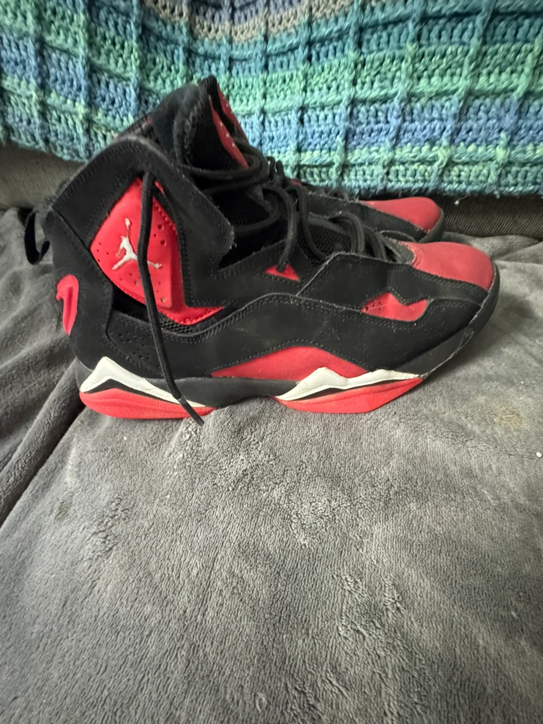 10Selling a pair of Jordan True Flight basketball shoes in size 9.5 They're in good condition and ready for the court or casual wear. The shoes feature a black and red colourway with the iconic Jumpman logo. Check out the photos for a closer look!