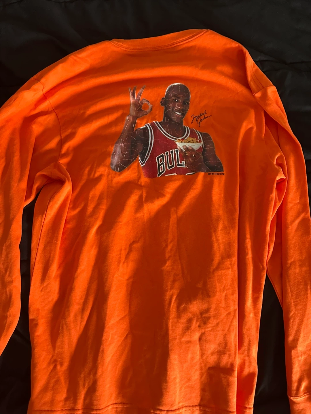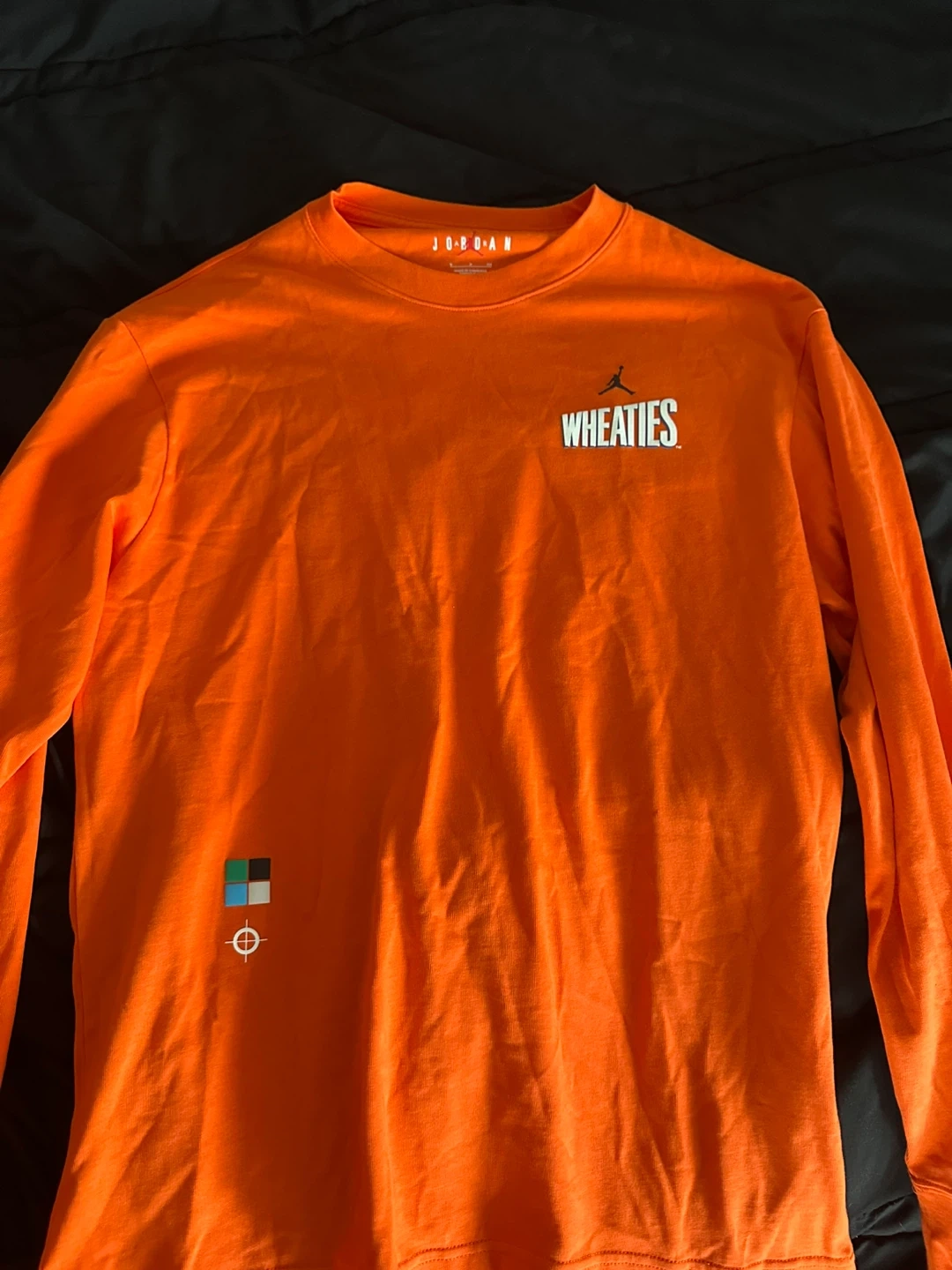 15Selling a Jordan Wheaties long-sleeve tee in size small. It's a vibrant orange colour and features Michael Jordan on the back with the Wheaties logo on the front. The material is comfortable and in great condition! worn once