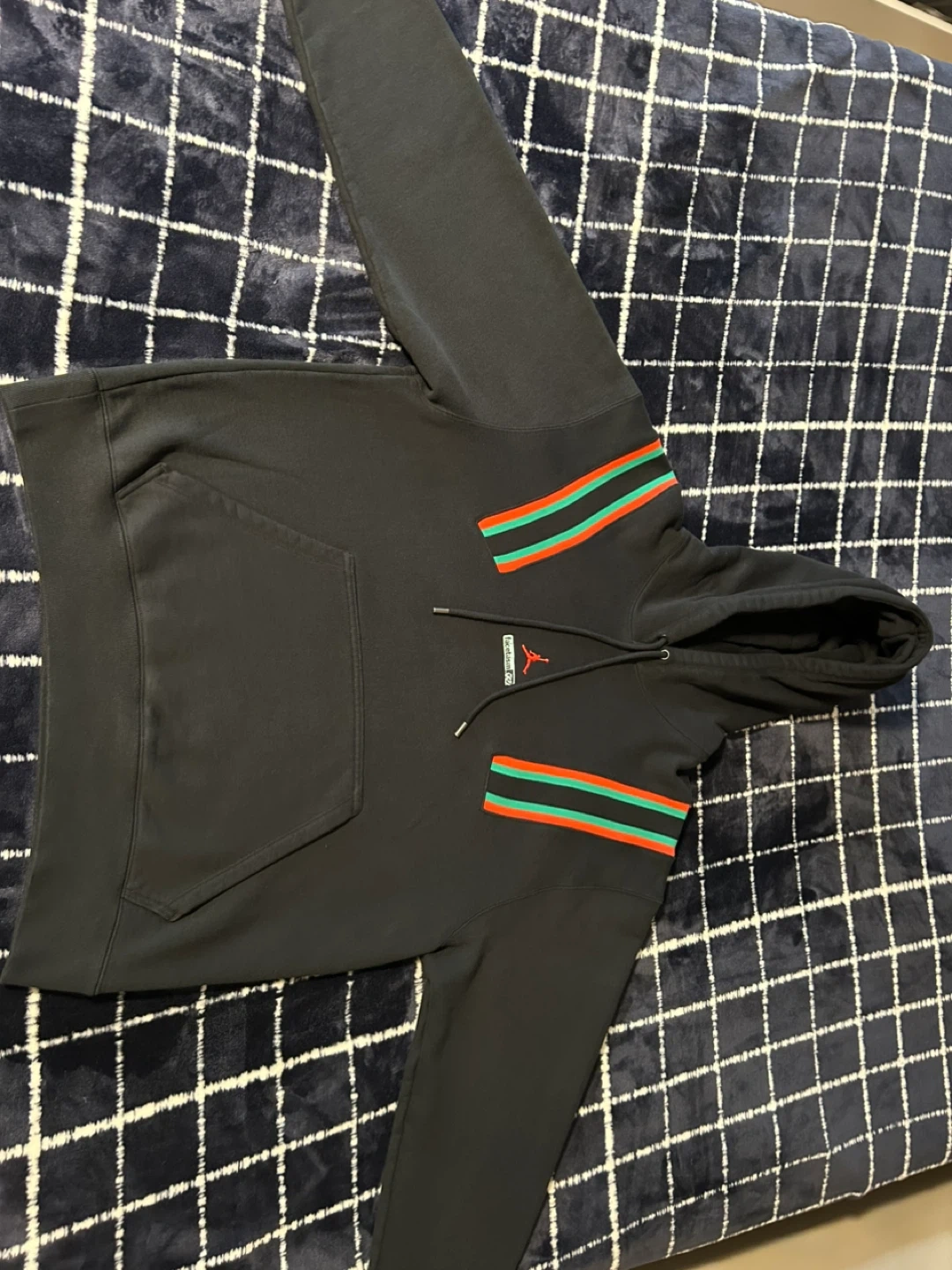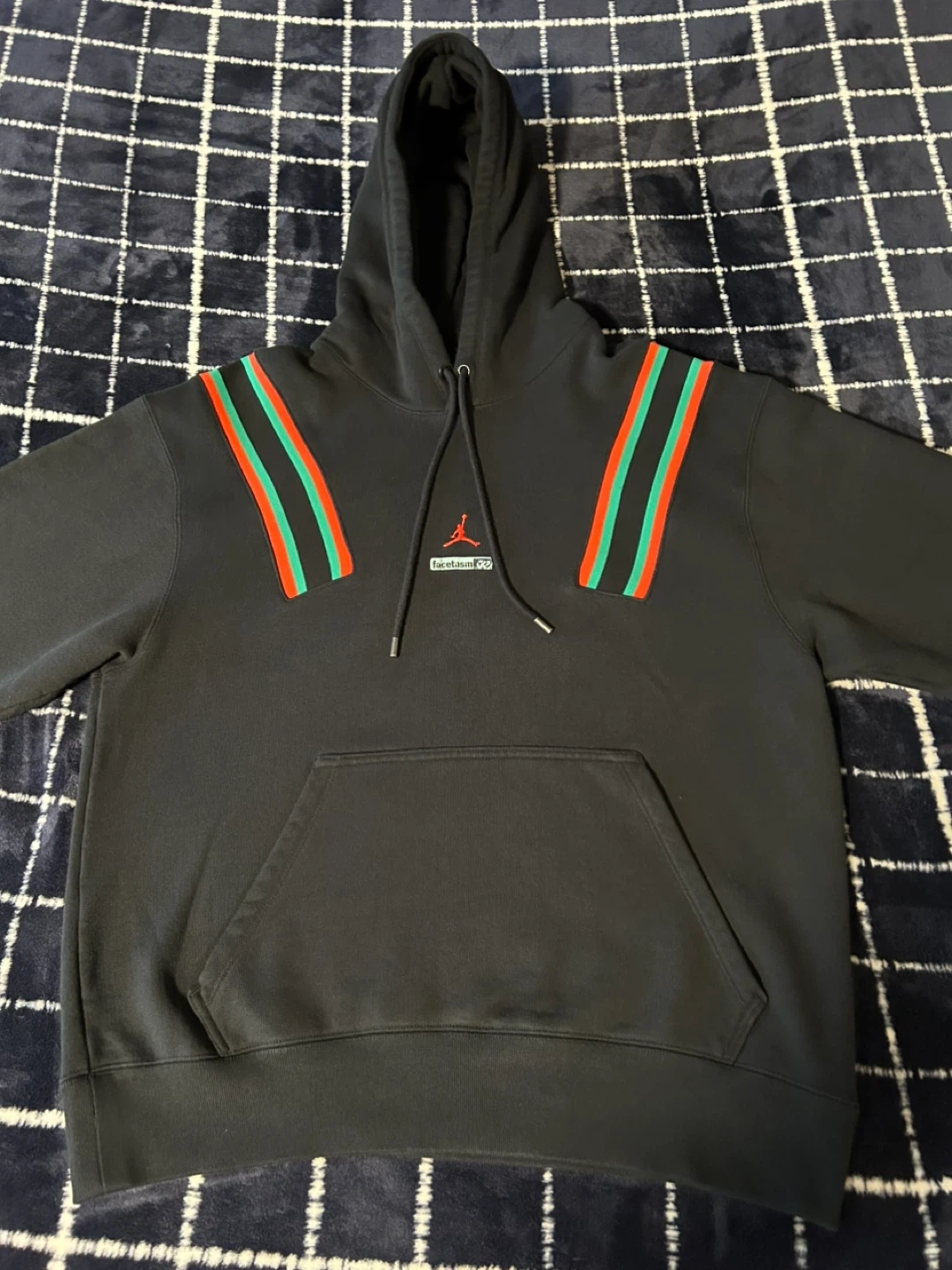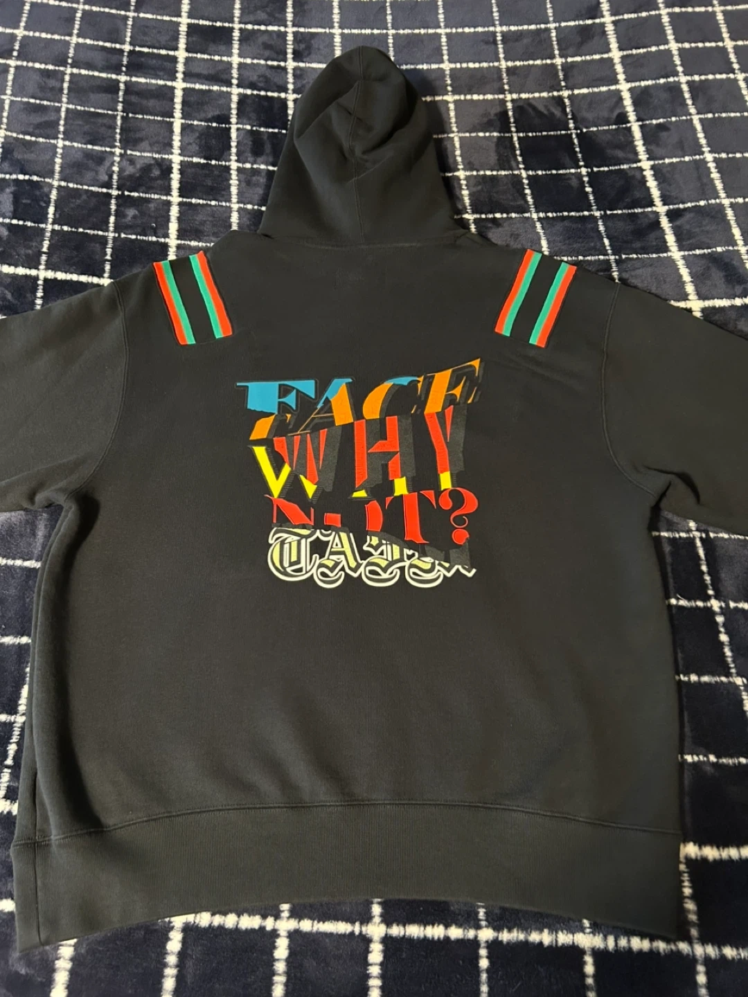 Jordan x Facetasm Hoodie in black. The hoodie features a unique design with colourful stripes on the shoulders and the text "FACE WHY?" on the back. It's in great condition and ready for a new home!