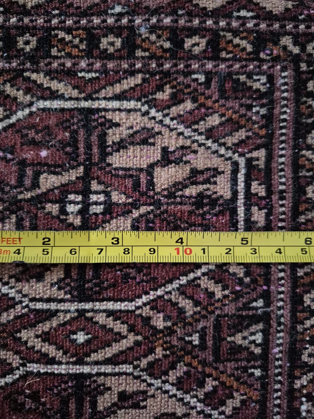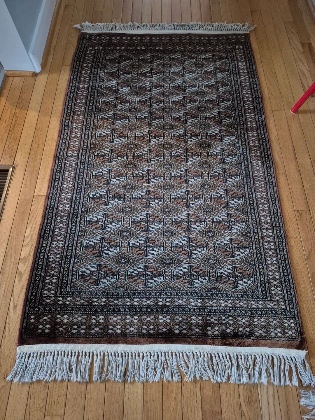 A lovely authentic Bokhara (Bukhara) in the classic pattern called "Elephant Foot". Handmade, 120 knots per square inch, wool.