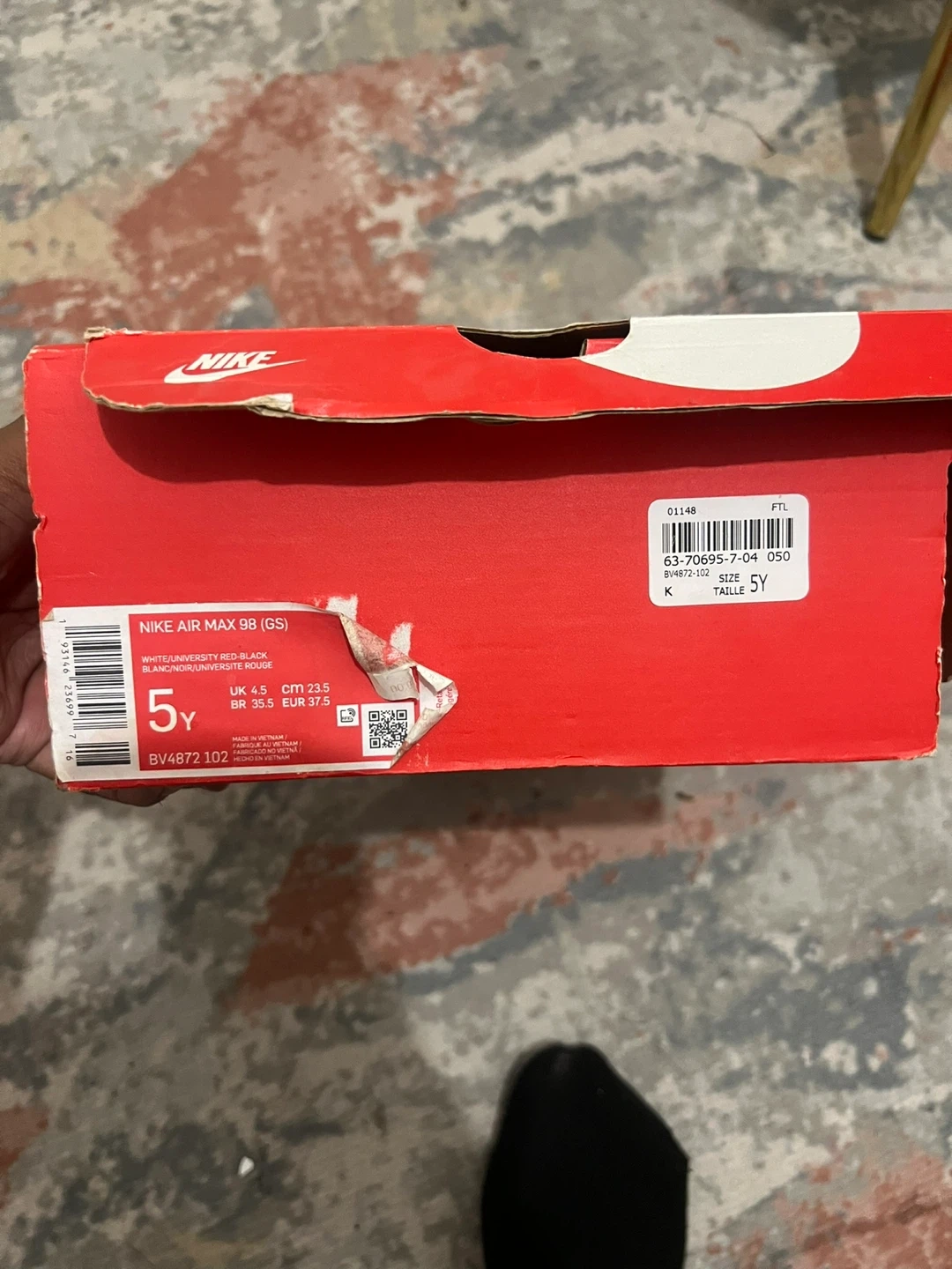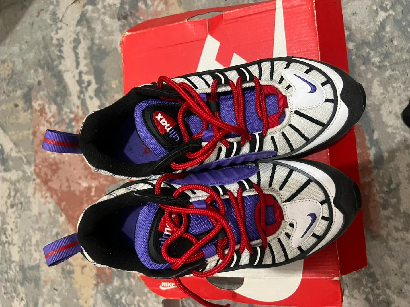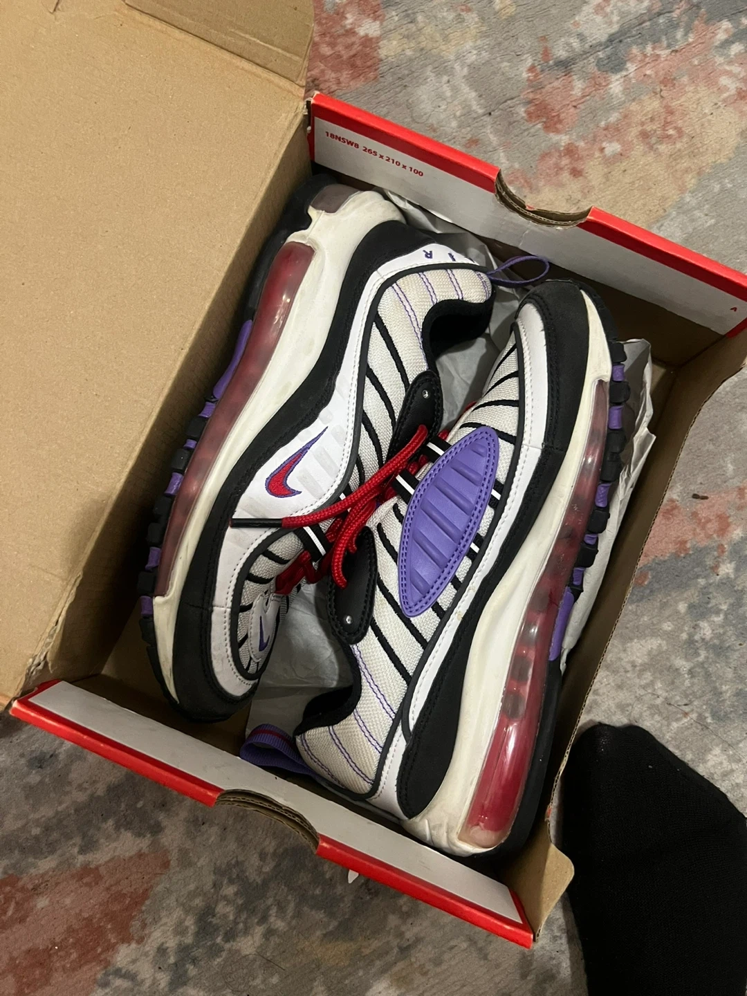 Selling a pair of Nike Air Max 98 sneakers! They feature a cool white, black, and purple colour scheme with red laces (raptors edition) The box is included!