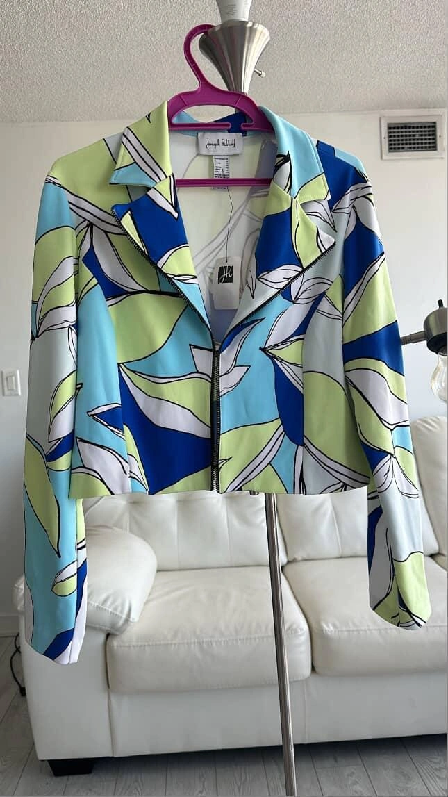 10This is a Joseph Ribkoff jacket with a vibrant floral print. The colours include shades of blue, green, and white. It's in excellent condition and ready for a new home!