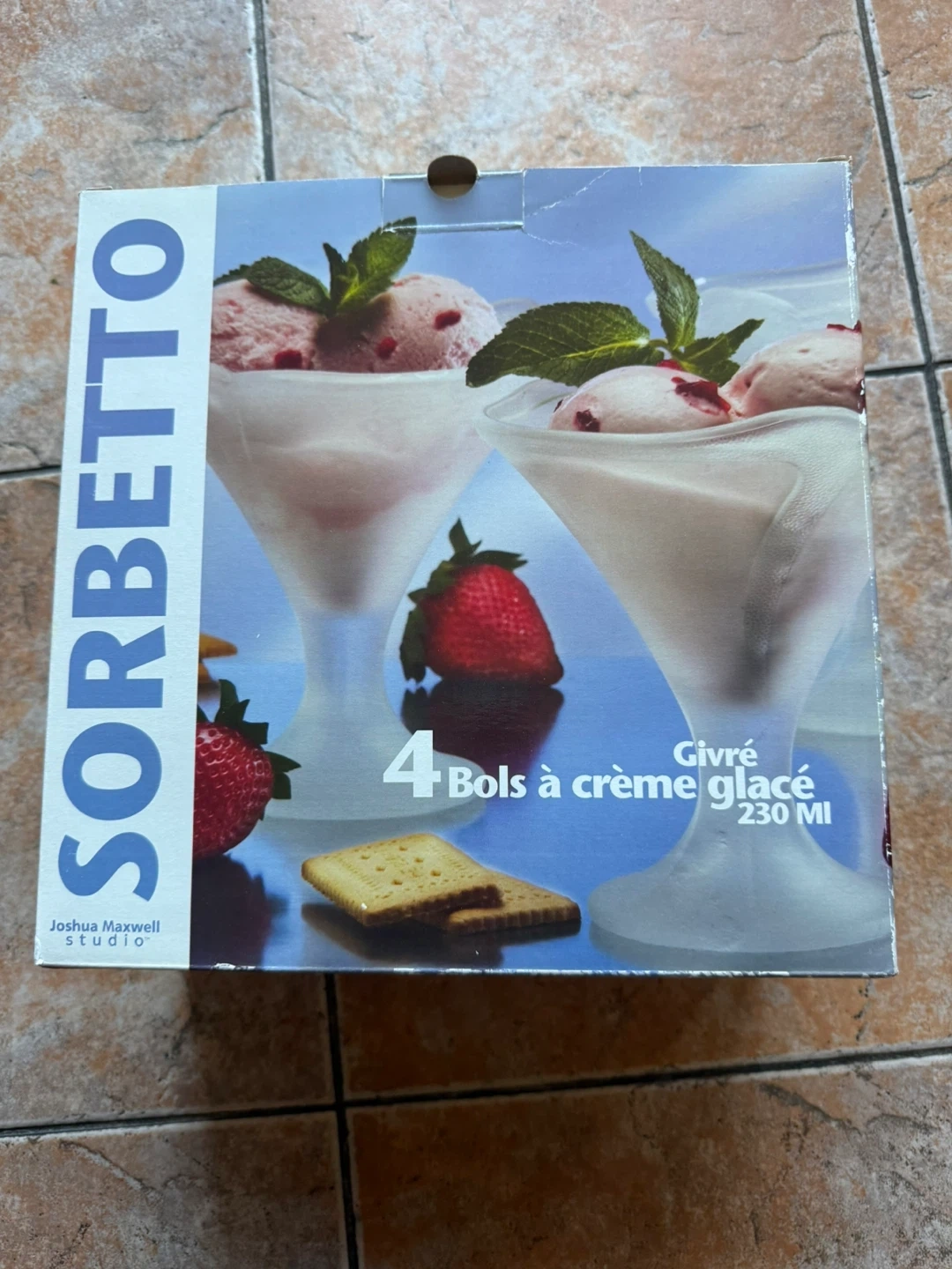 Selling a set of 4 Joshua Maxwell Studio Sorbetto bowls! These bowls are perfect for serving ice cream or other desserts. They are in great condition and ready for a new home. The bowls are made of frosted glass and each holds 230 ml.