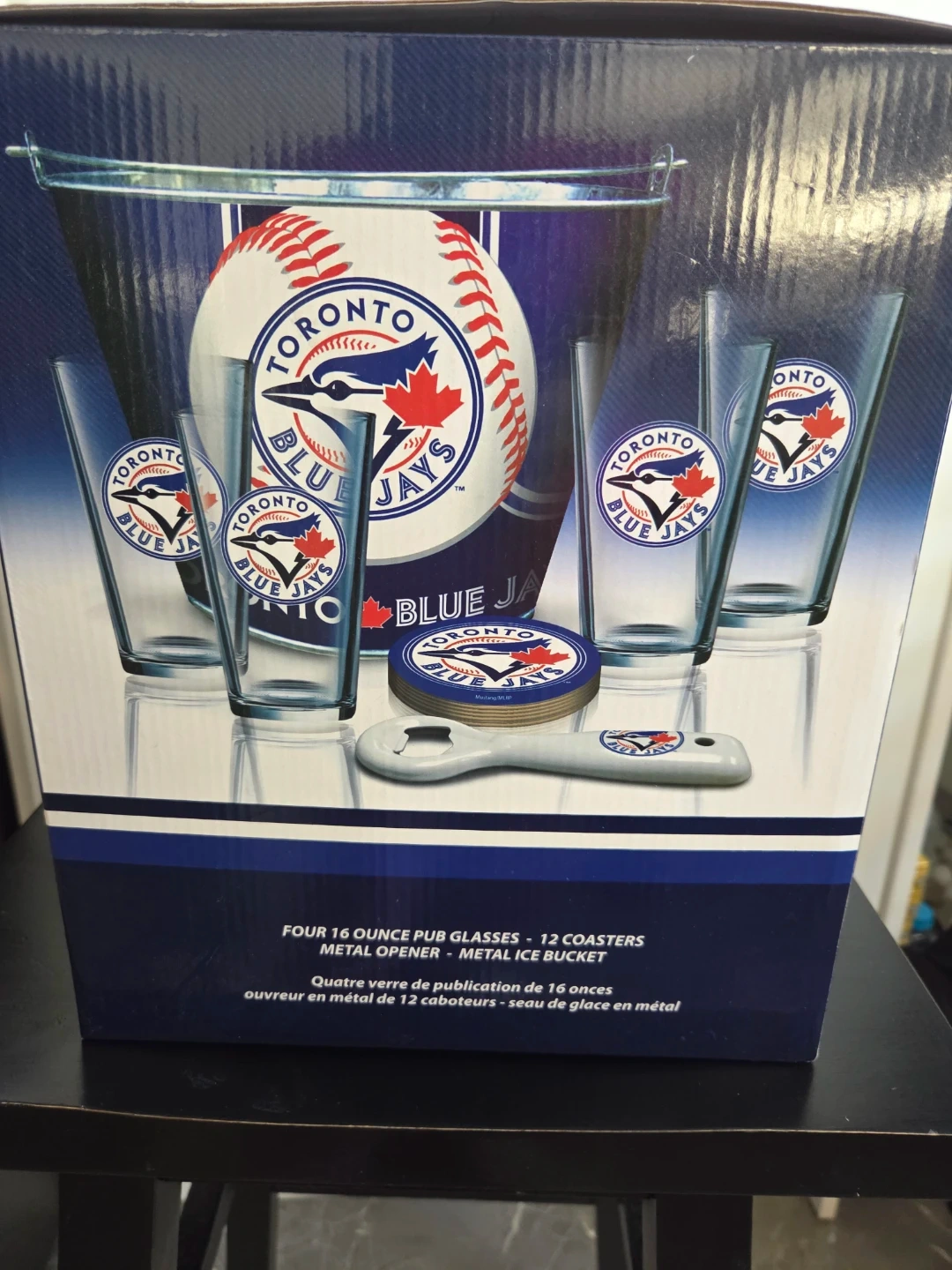 This ice bucket set features the Toronto Blue Jays logo. It includes four 16 oz pub glasses, 12 coasters, and a metal bottle opener. The set comes in its original packaging, making it a great gift for any fan!