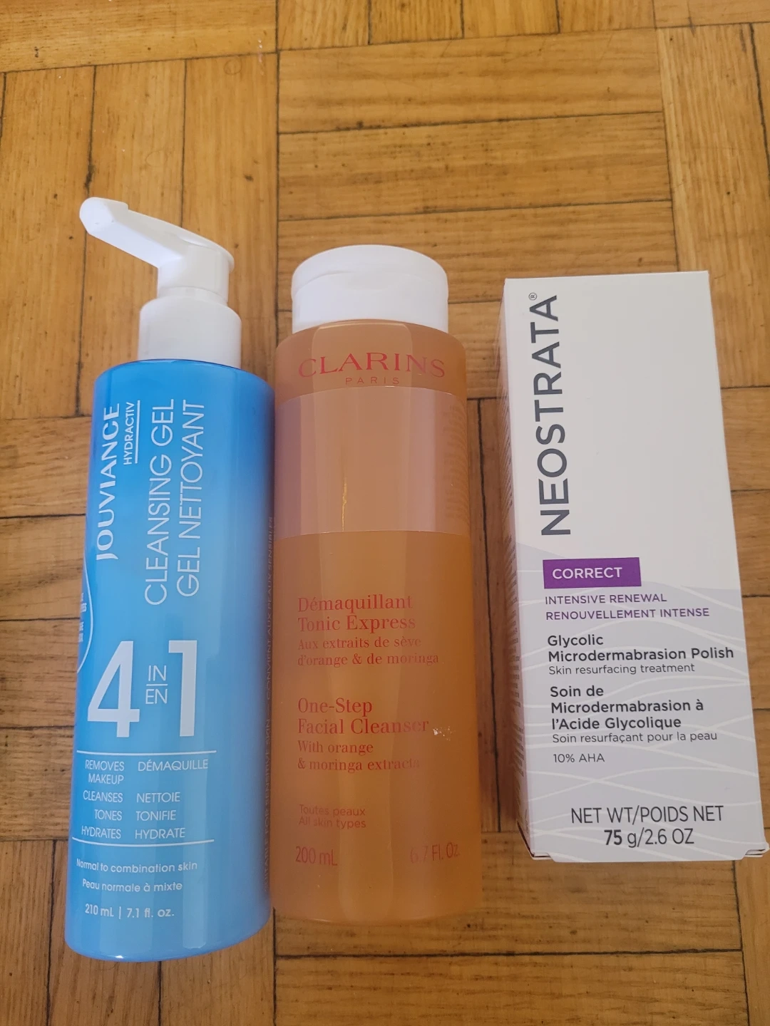 34Selling a skincare lot featuring three great brands! Included is Jouviance cleansing gel, Clarins démaquillant tonic express, and Neostrata glycolic microdermabrasion polish