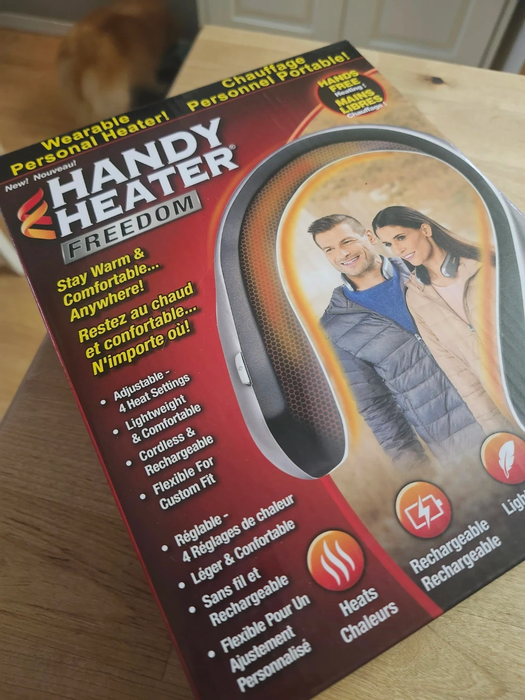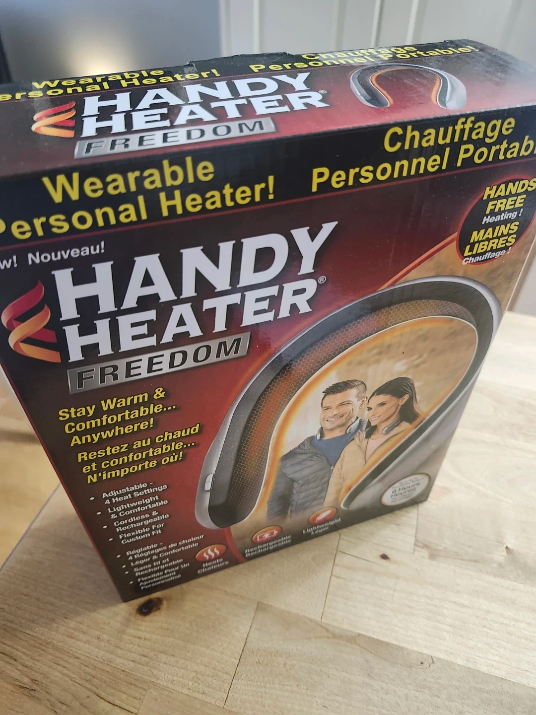 Stay warm and comfortable anywhere with this Handy Heater Freedom wearable personal heater. It's adjustable with 4 heat settings, lightweight, and comfortable to wear. This cord-free and rechargeable device is flexible for a custom fit.