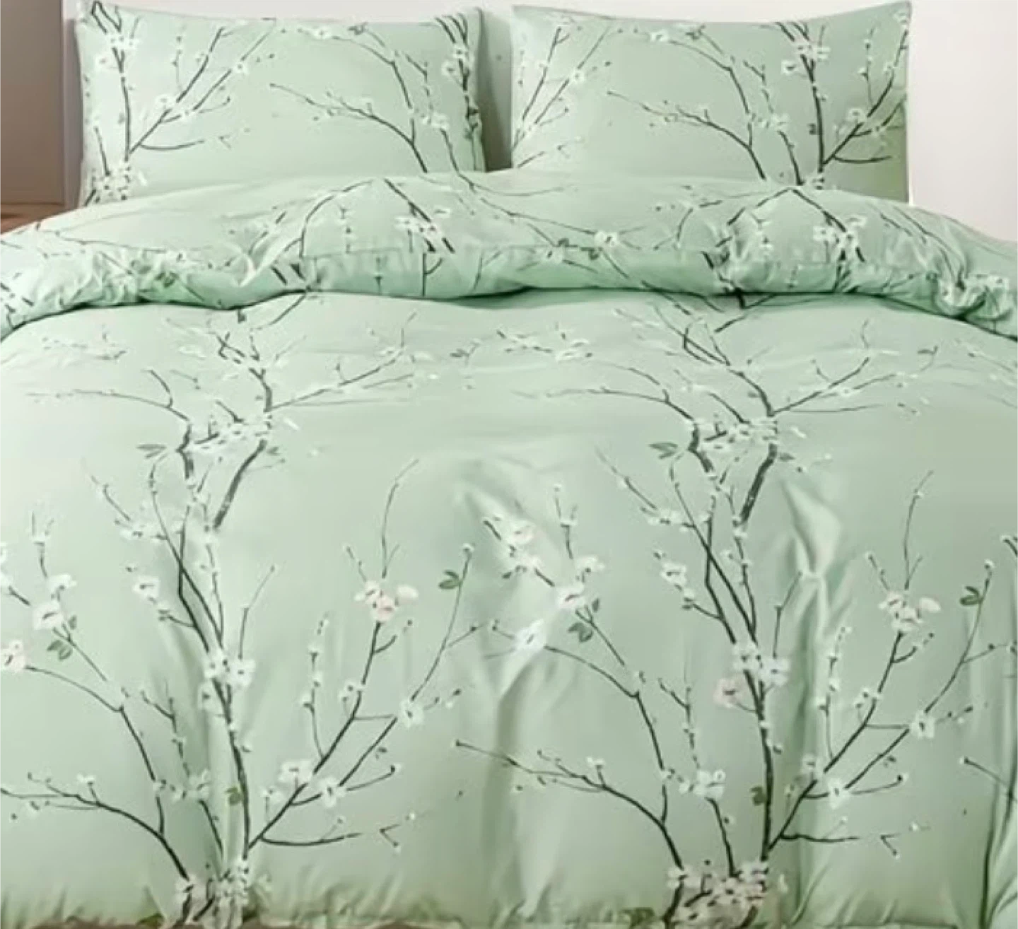 This duvet cover set features a soothing light green background with a delicate white and dark branch floral pattern.