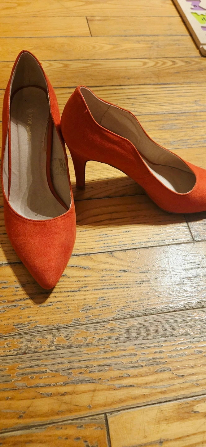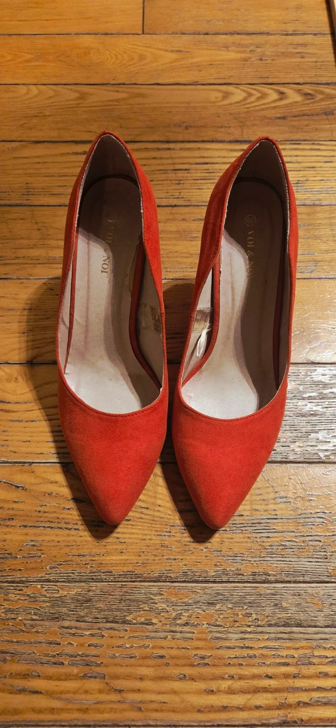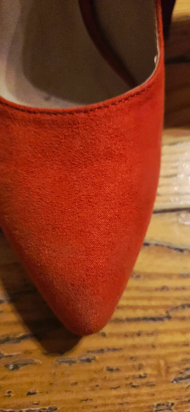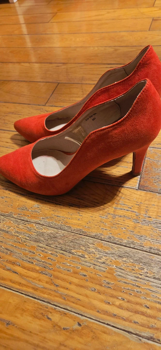 These heels are a vibrant red suede. They feature a classic pointed toe and a moderate heel height. This style is great for dressing up an outfit!