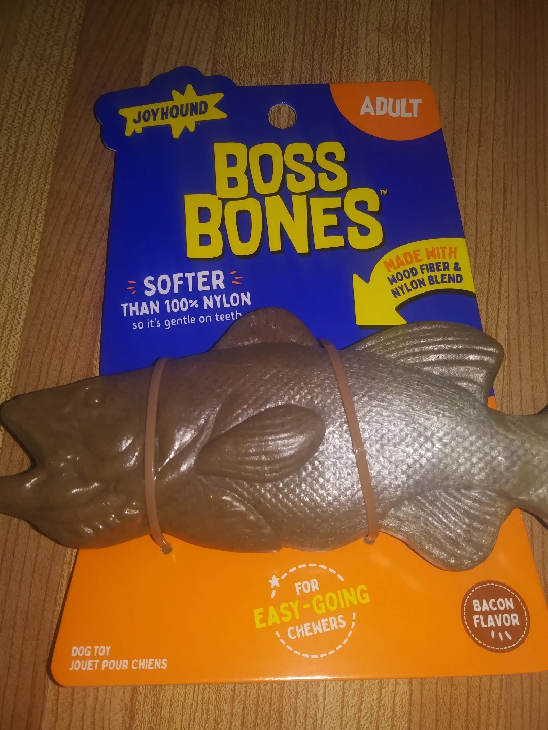 36Selling a Joyhound Boss Bones dog toy for adult dogs! It's made with wood fiber and nylon blend, and is softer than 100% nylon, so it's gentle on your dog's teeth. It's also bacon flavored for easy-going chewers!