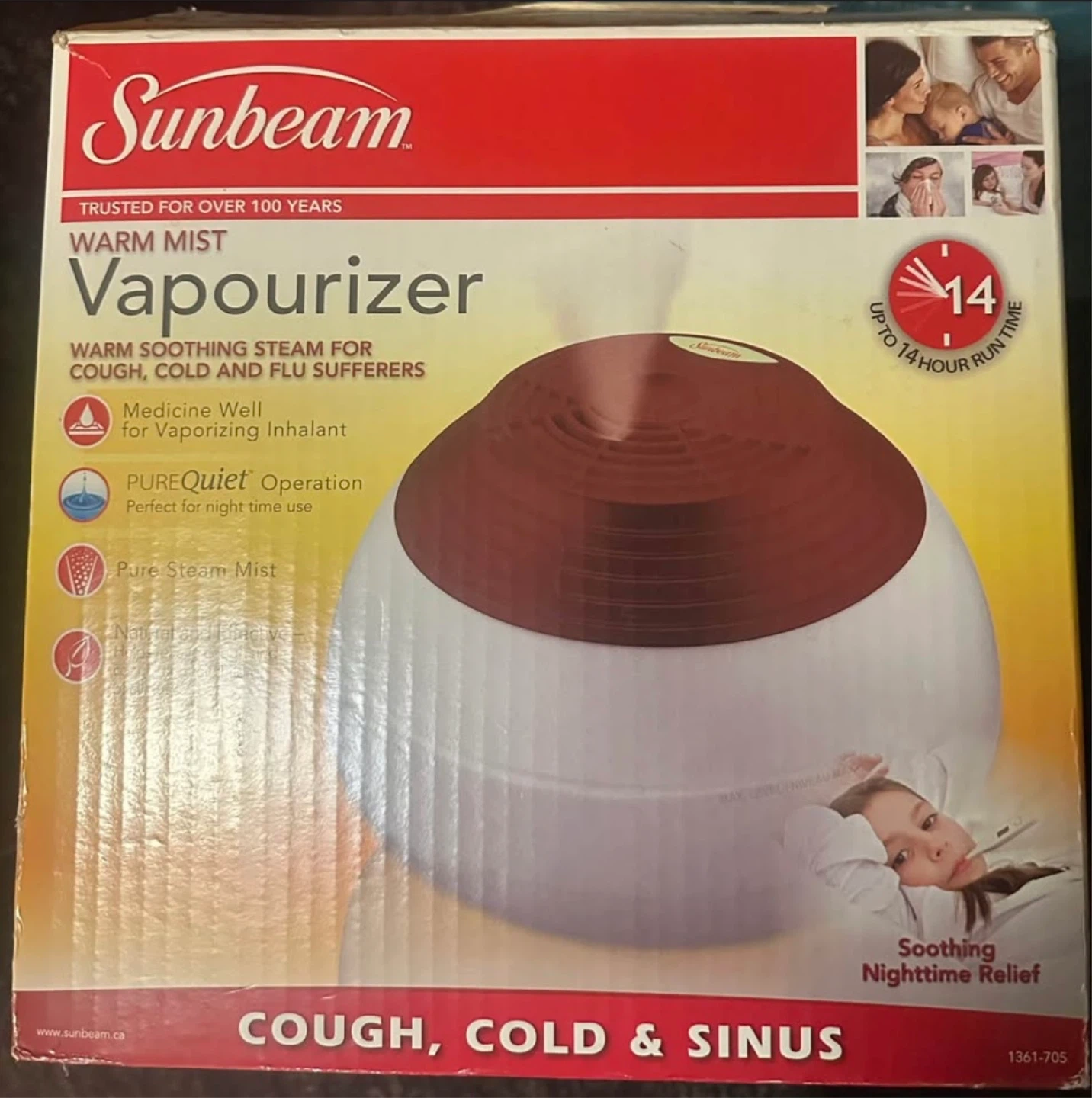 This Sunbeam Warm Mist Vapourizer provides warm, soothing steam for cough, cold, and flu sufferers. It offers PUREQuiet Operation, making it perfect for night time use. It's designed for cough, cold, and sinus relief.