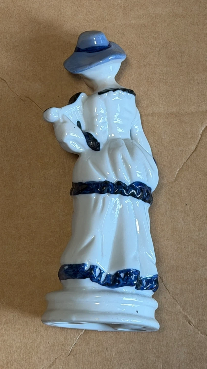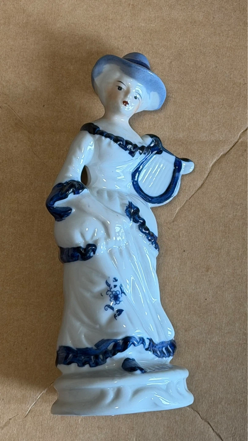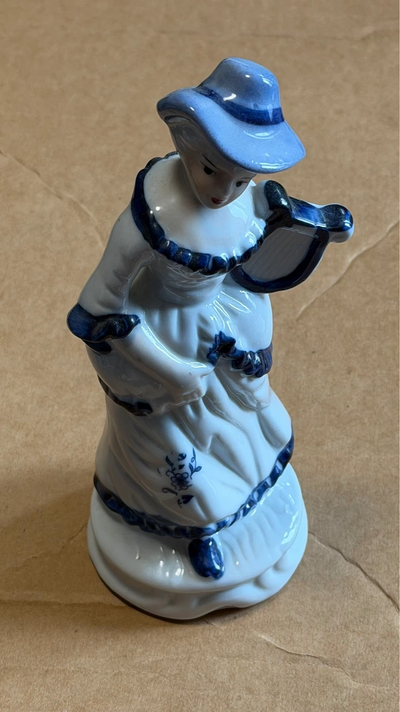 Ceramic figurine of a lady in a blue hat and white dress with blue trim. She's holding what appears to be a lyre. Measures approximately 7 inches tall. White porcelain with blue accents. Adds a touch of elegance to any shelf!
