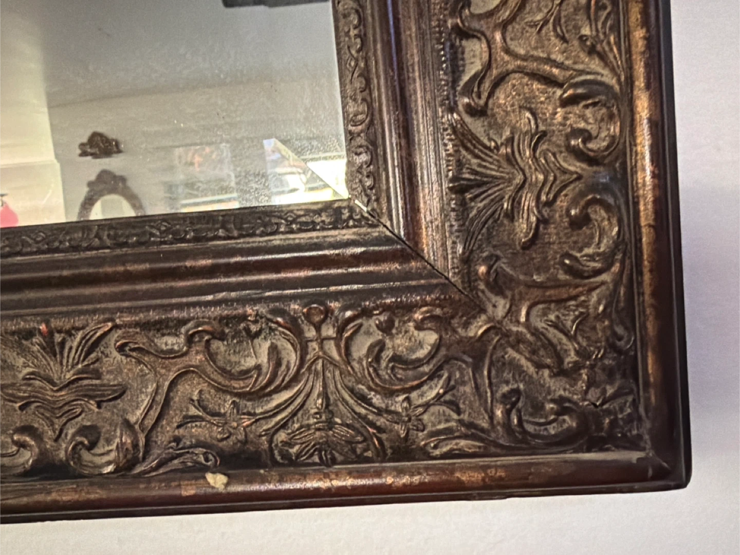 This is a decorative wall mirror with an ornate, carved frame. The frame has a dark, antiqued finish. It's perfect for adding a touch of elegance to any room.