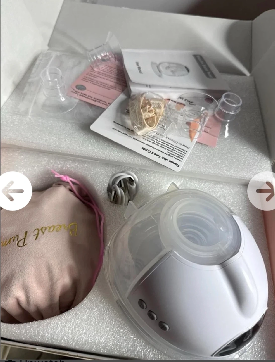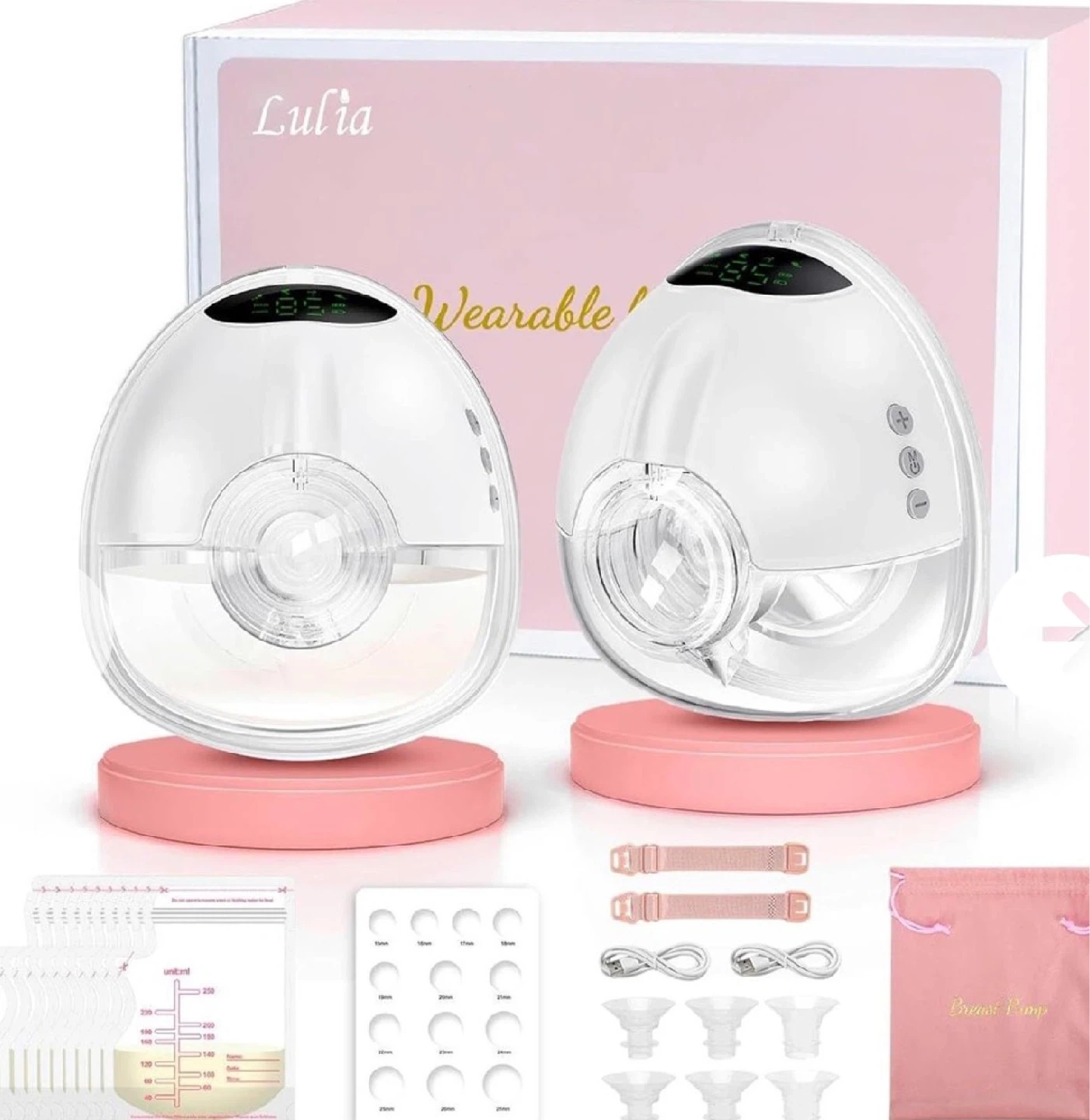 White Lulia wearable breast pump with digital display. Includes charging cables, bra adjusters, and a pink storage bag. Two pumps included.