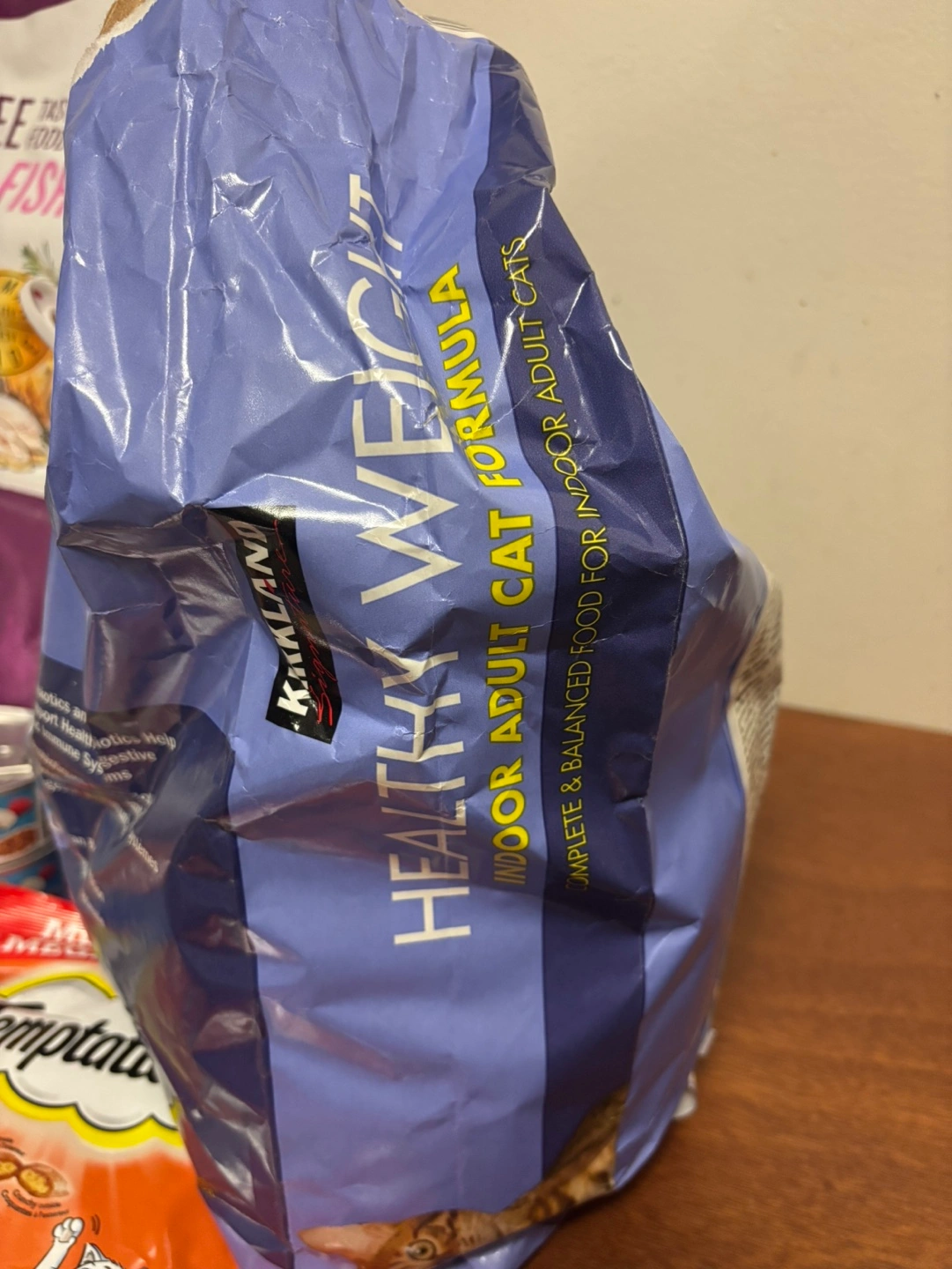 Located in NW, half a bag left. FCFS. Partially used bag of Kirkland Signature Healthy Weight Indoor Adult Cat Formula for adult cats. Complete and balanced food. Probiotics and prebiotics support healthy digestive and immune systems. Supports body condition.