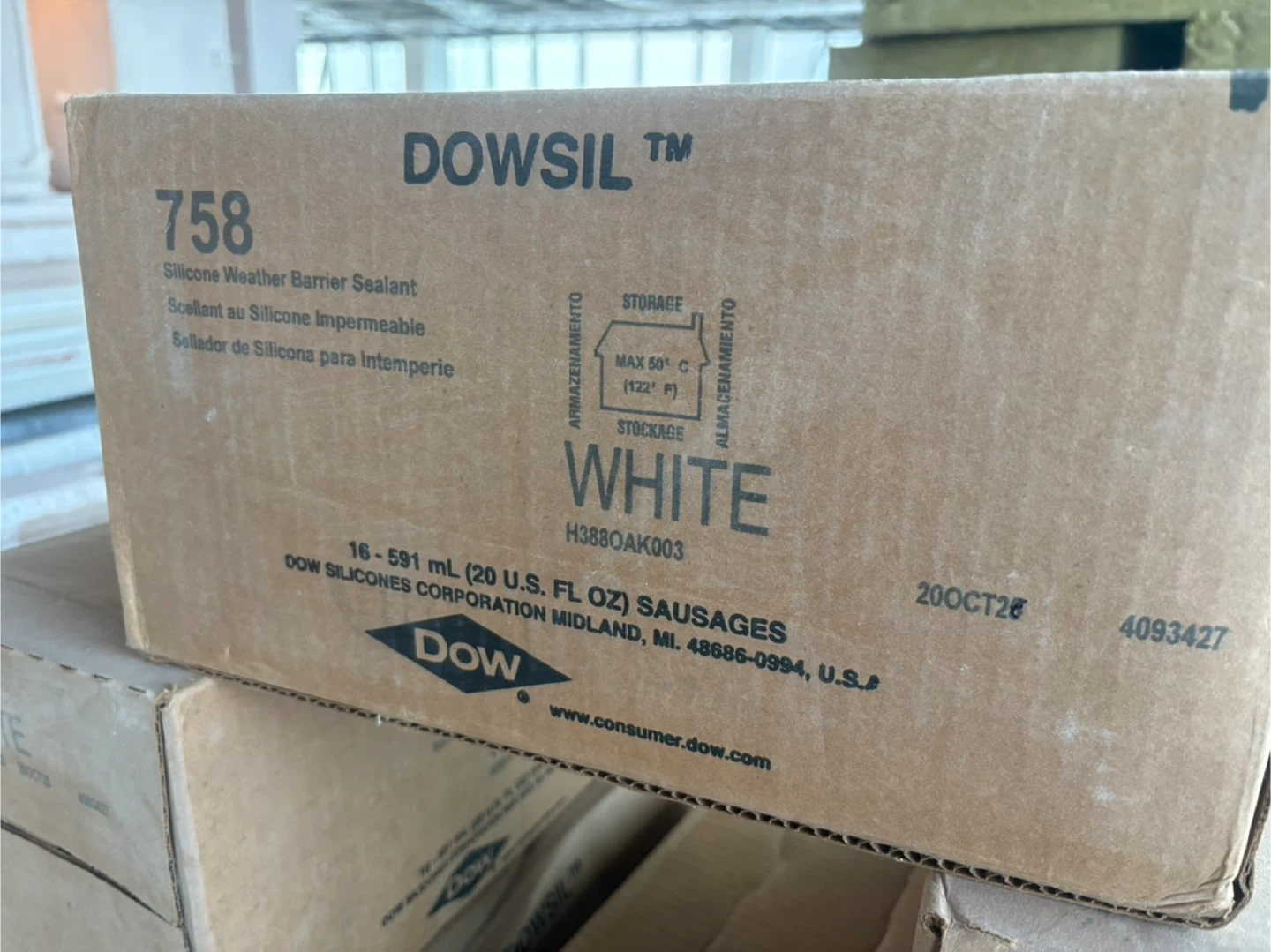 This is a box of DOWSIL 758 Silicone Weather Barrier Sealant. It's white in colour and comes in 16 - 591 ml (20 U.S. FL OZ) sausages. Maximum storage temperature is 50° C (122° F).