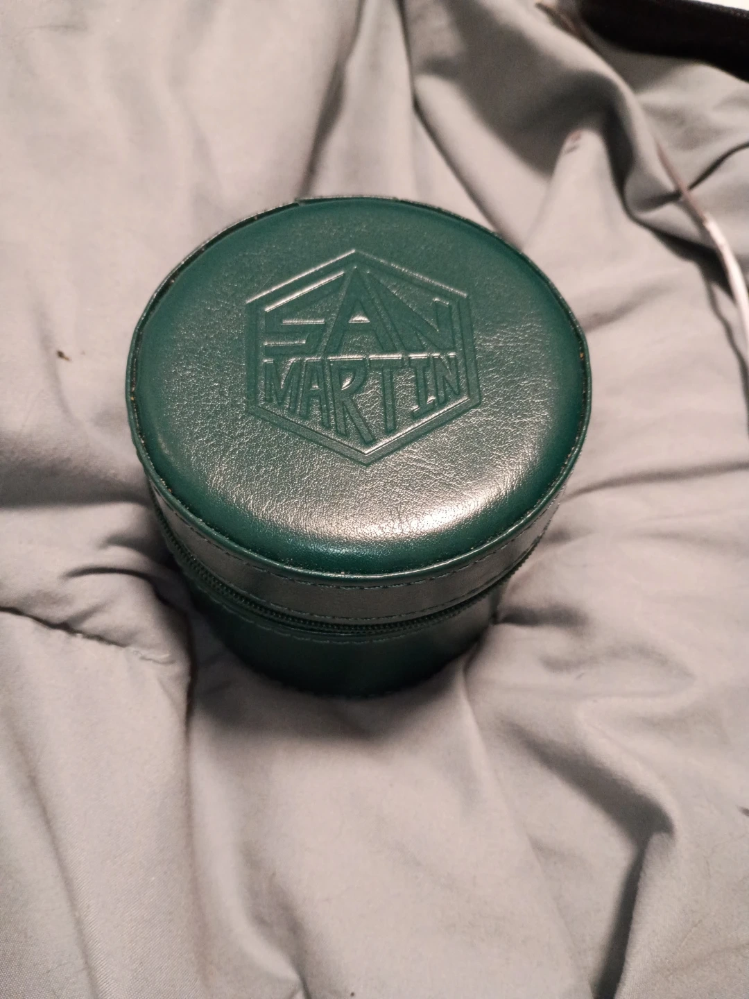 This is a San Martin automatic watch in a green case. It's a nice timepiece for everyday wear. The watch has a red dial and a metal band. Retail for 650