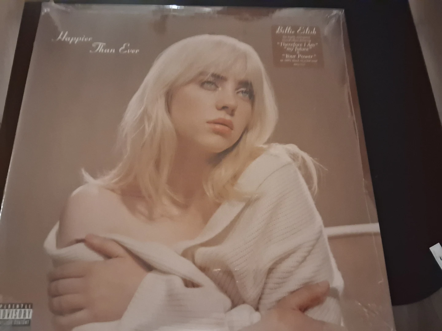 Billie Eilish's album "Happier Than Ever" on vinyl. This record features hit songs like "Therefore I Am" and "My Future". It comes sealed and in excellent condition stillin wrapper.( And pick up only )