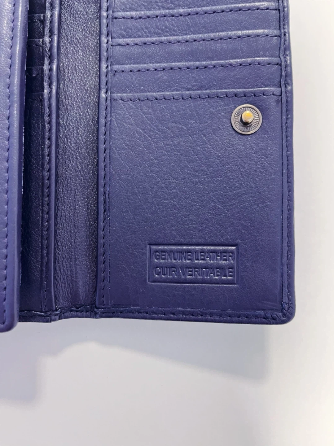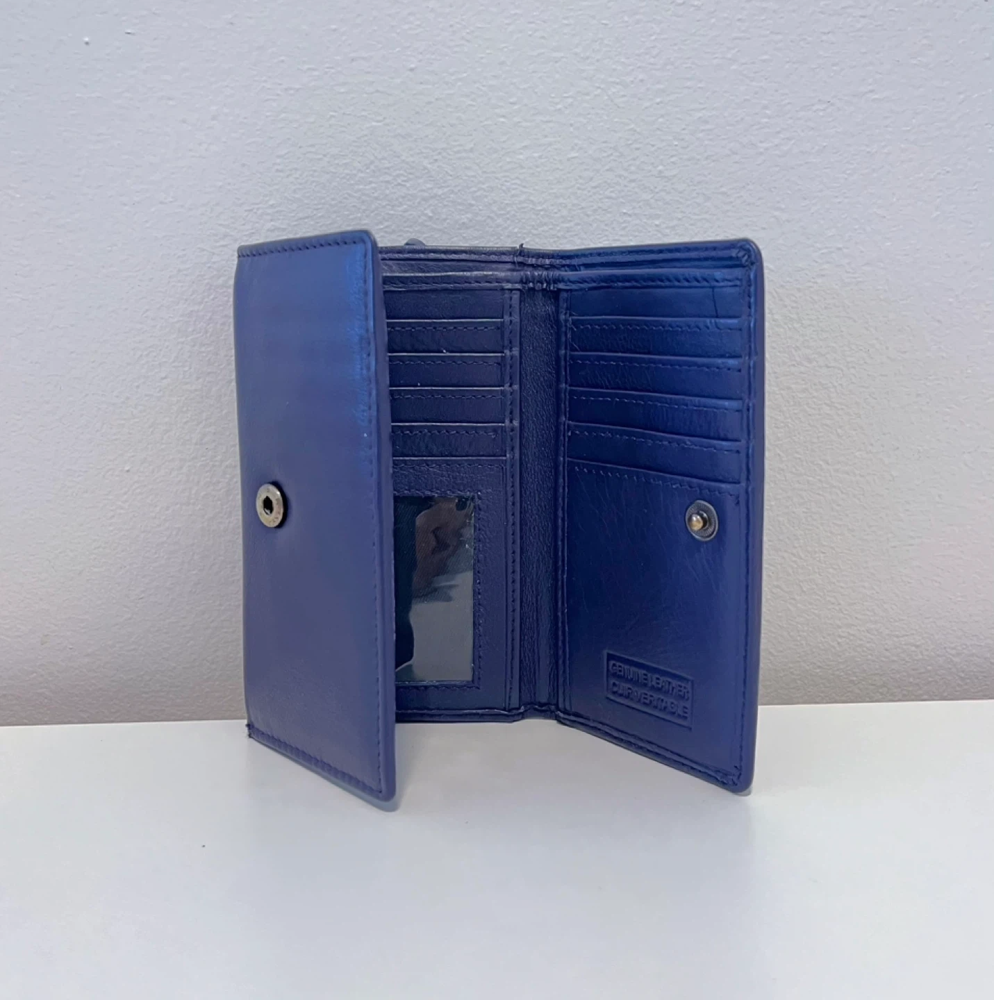 This blue wallet is made from genuine leather. It has multiple card slots and a clear ID window. A snap closure keeps everything secure.