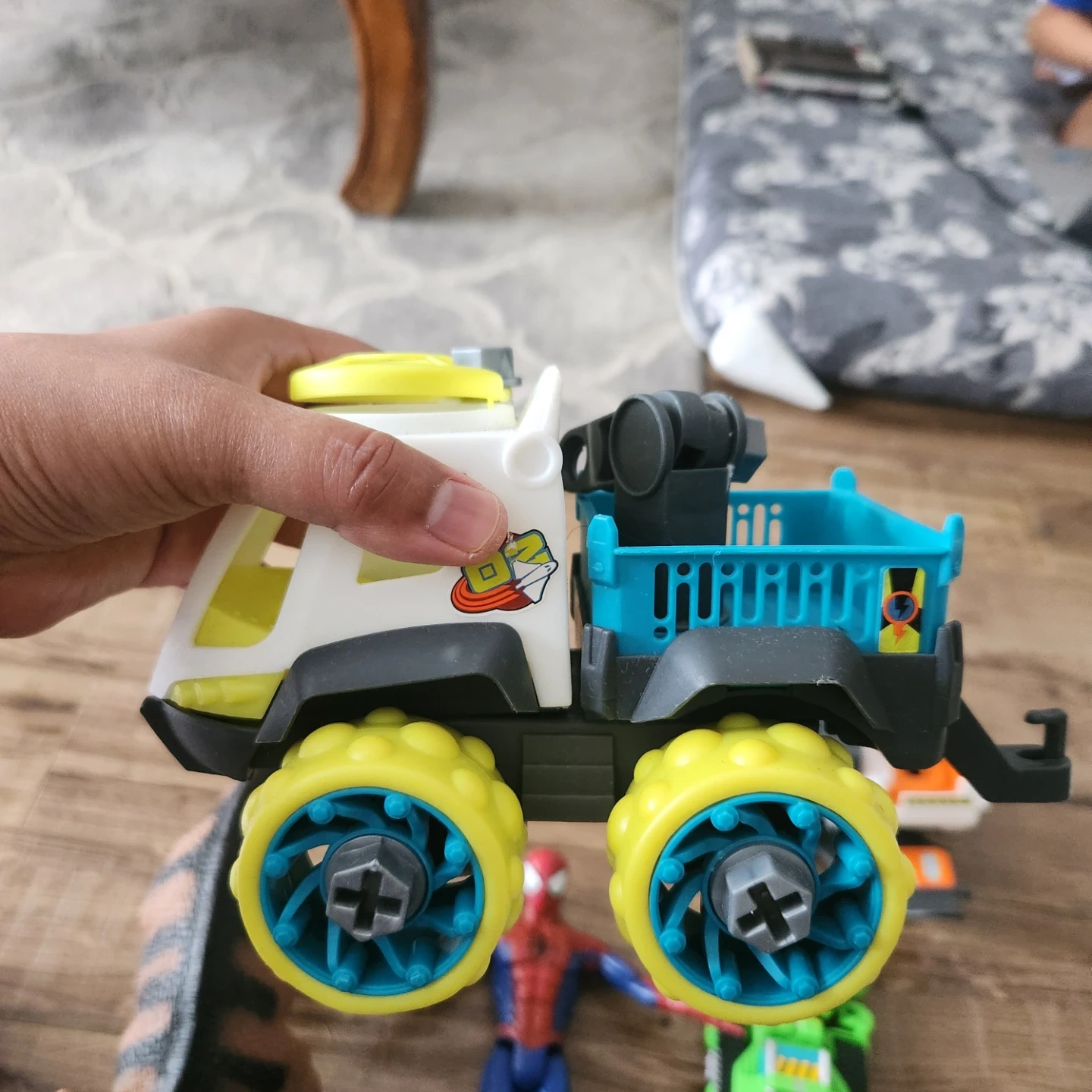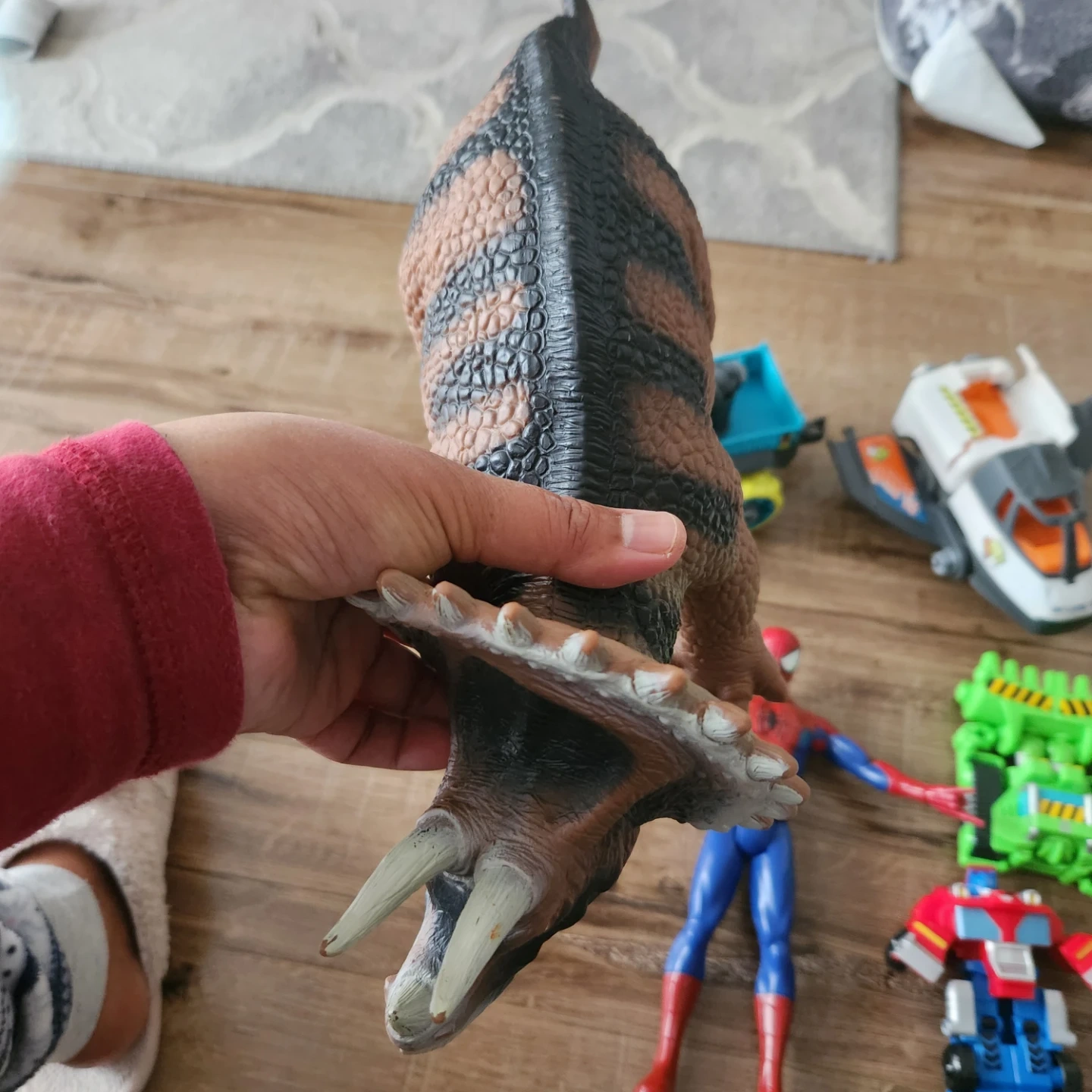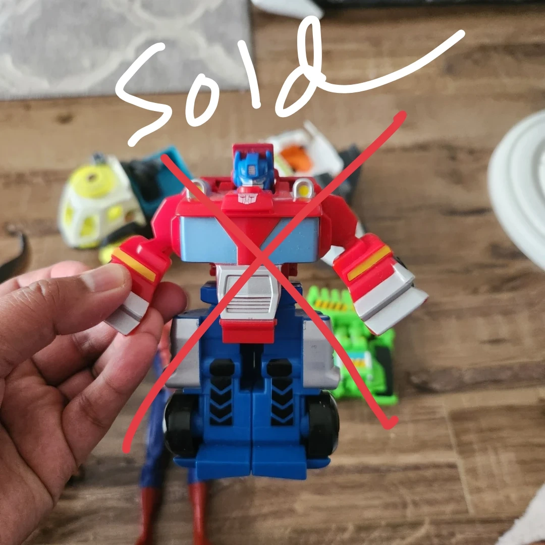 Selling a mixed lot of toy vehicles and an action figure. Includes a red and blue robot toy, a white and yellow truck, a white and orange space shuttle, a green tractor toy, and a Spiderman action figure. Great for kids!