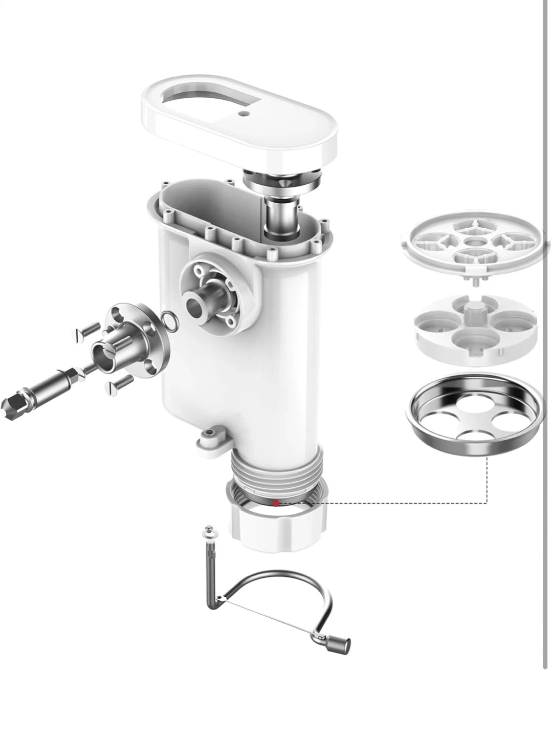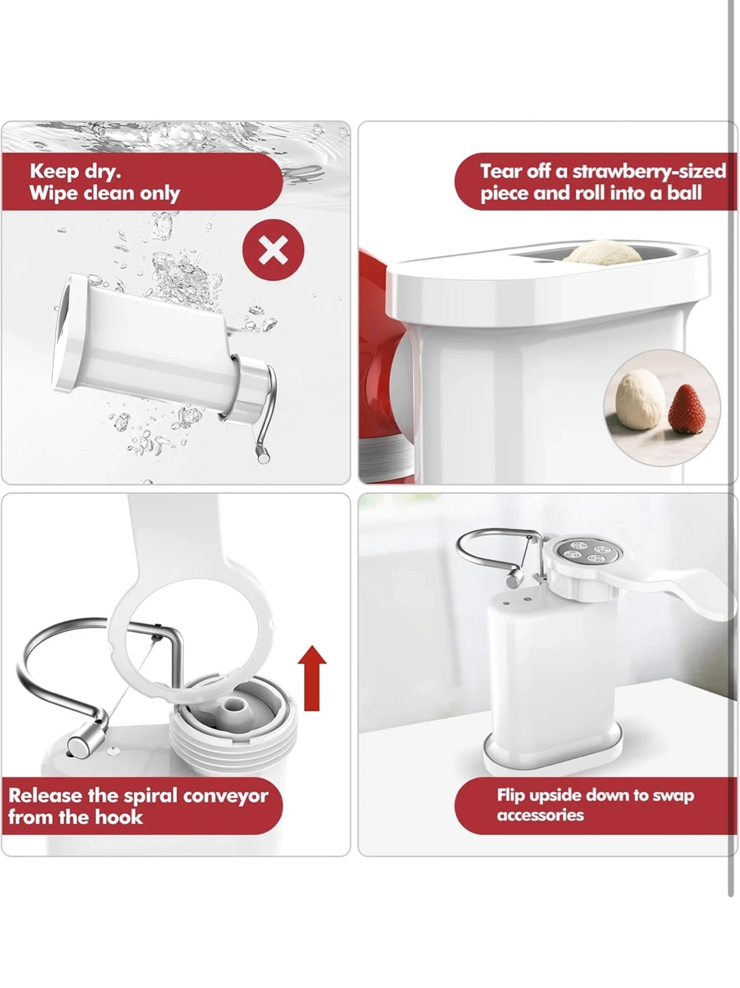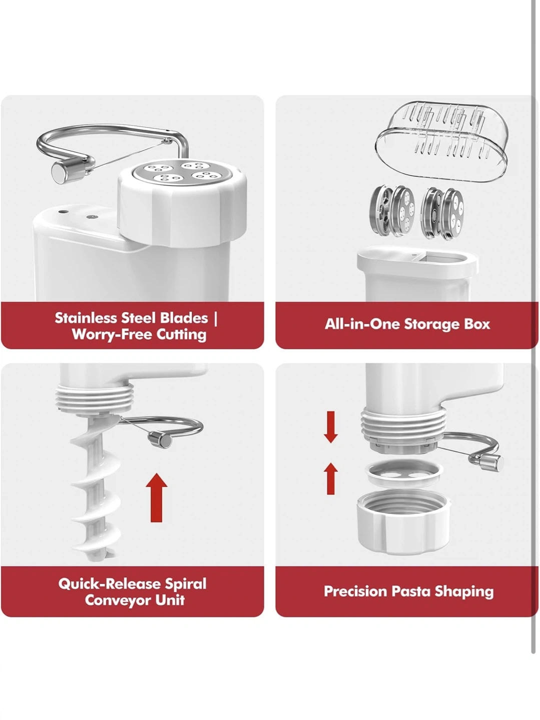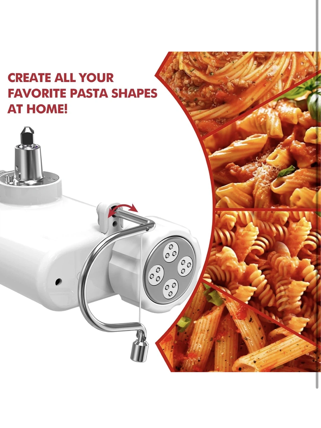 This attachment lets you create all your favourite pasta shapes at home! Includes multiple dies for different pasta types and a cleaning brush. Easily makes spaghetti, penne, fusilli, and more.