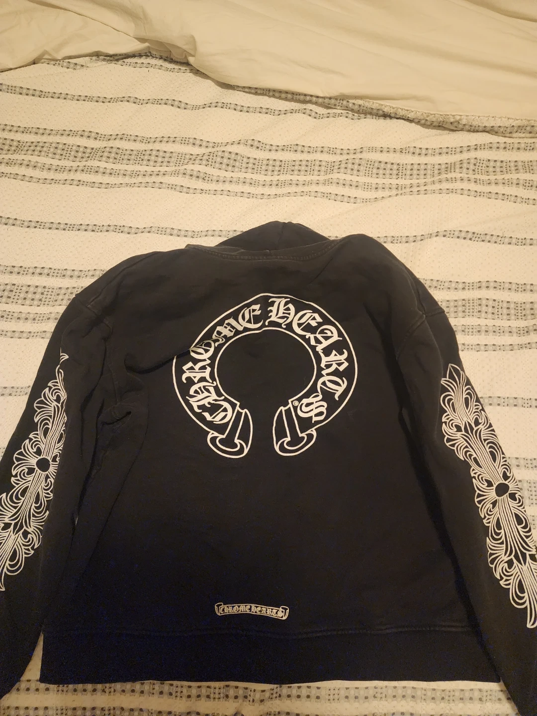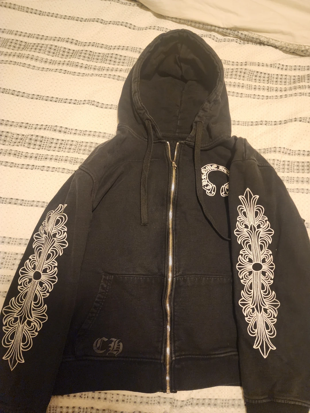 Black zip-up hoodie from Chrome Hearts. Features the iconic CH logo on the front and full scroll designs on the sleeves and back. Made from a comfortable cotton blend. Fits L-XL.