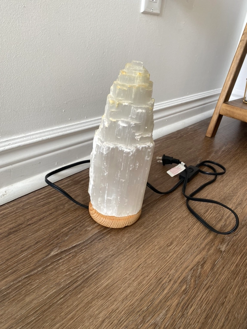 White selenite crystal lamp with wooden base and cord. Slight yellowing at the top from essential oil use.