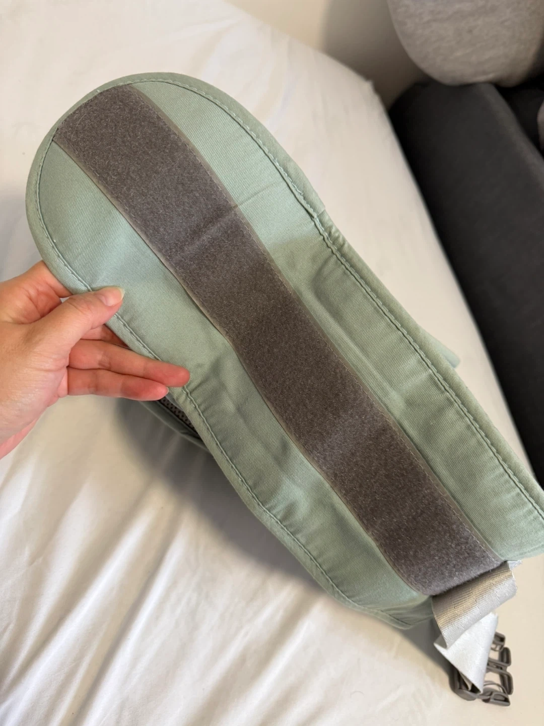 This hip seat baby carrier in a mint green colour.
