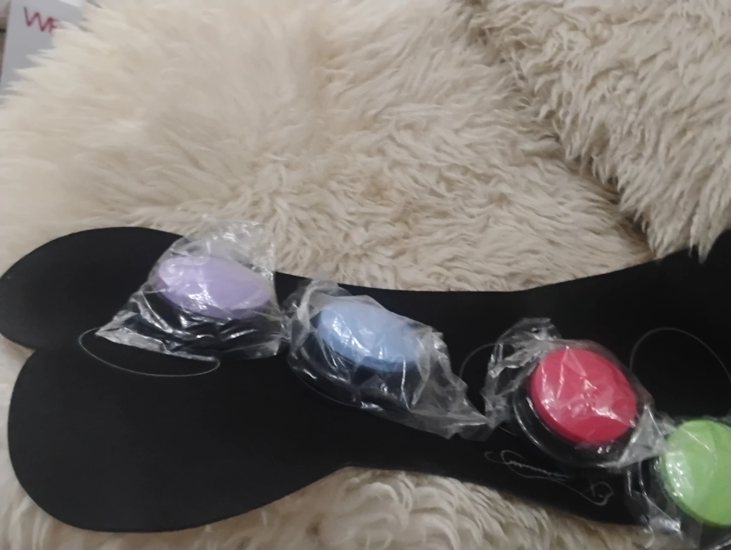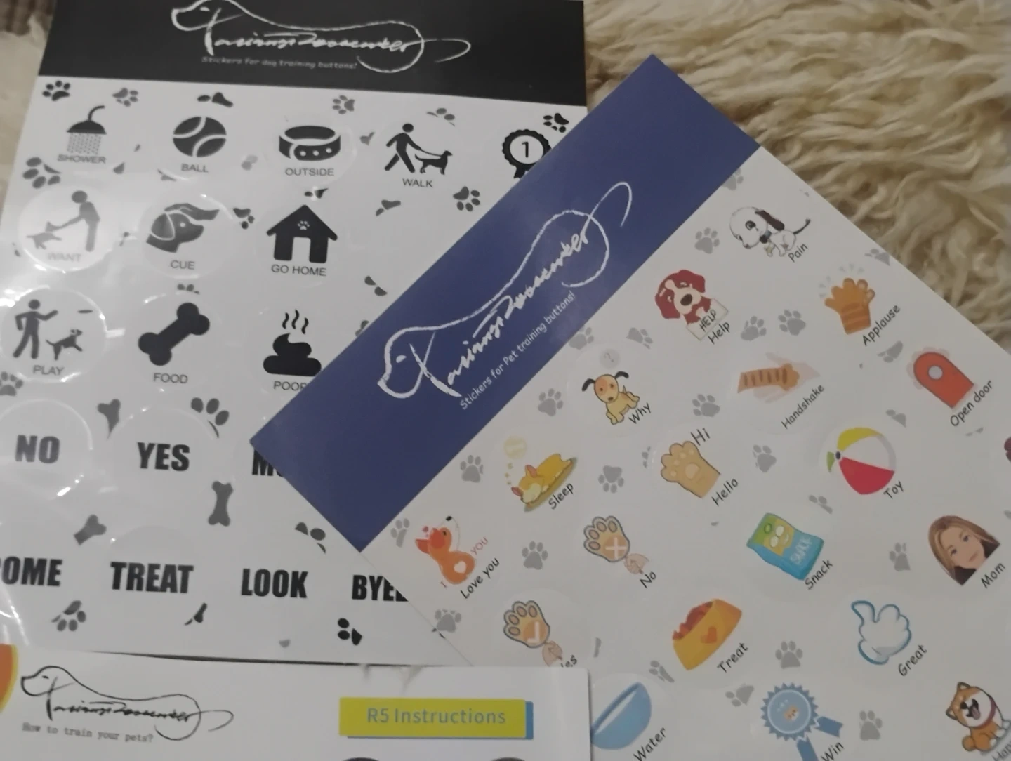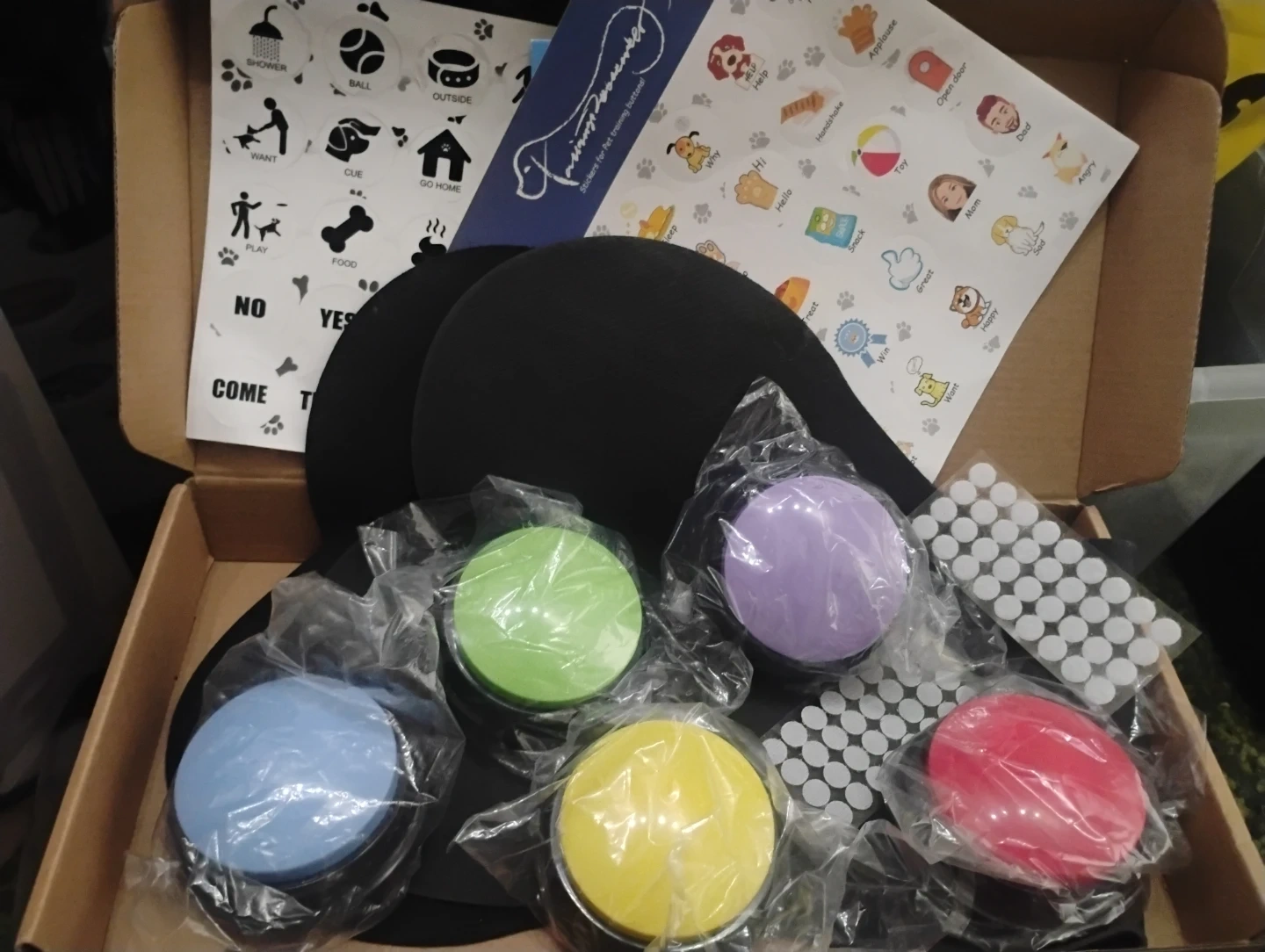 This set includes pet training buttons and various stickers for communication. It comes with multiple coloured buttons and a variety of stickers featuring words and icons for training. Also includes instructions and adhesive dots.