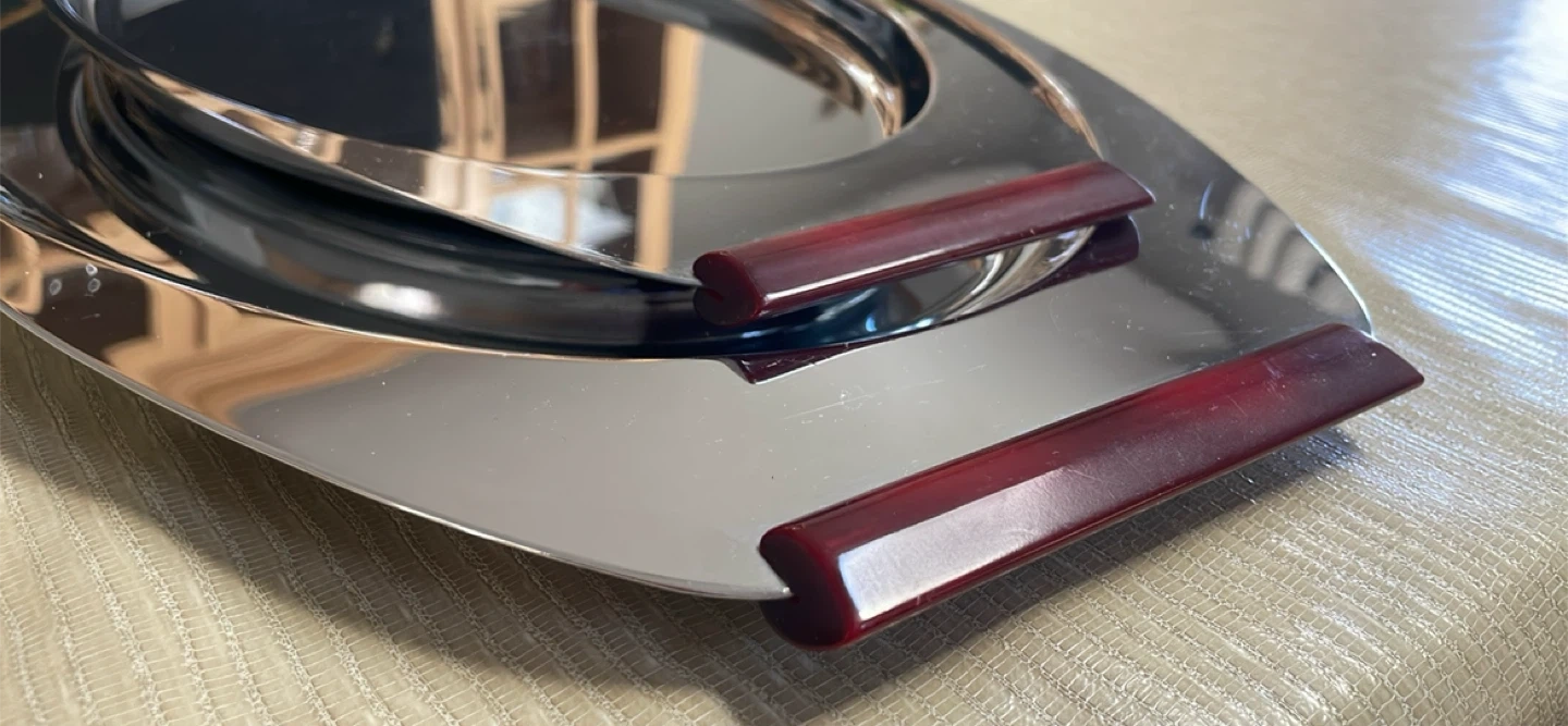 This set includes two oval serving platters. They feature a shiny silver-toned metal construction and dark red, rectangular handles on each end. Perfect for serving appetizers or snacks at a gathering!