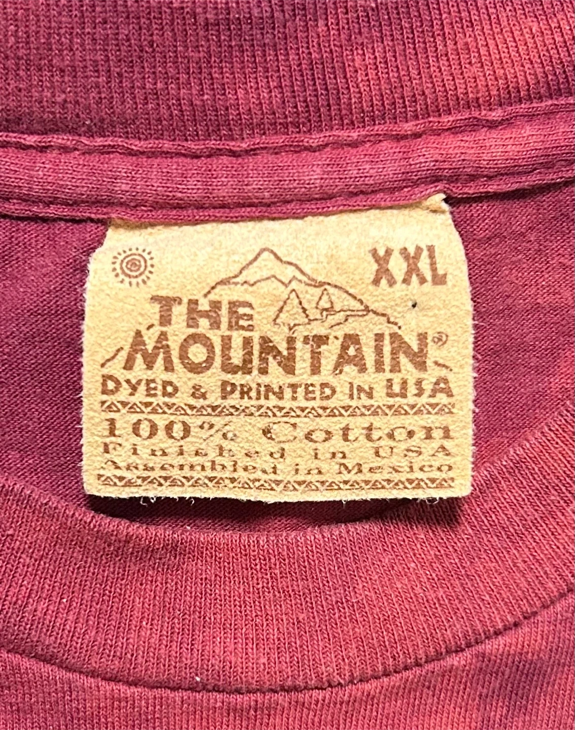 This is a size XXL t-shirt from The Mountain. It's made of 100% cotton and was dyed and printed in the USA. The shirt features a unique tie-dye pattern and a graphic print on the front. It's machine washable in cold water and can be tumble dried on medium.