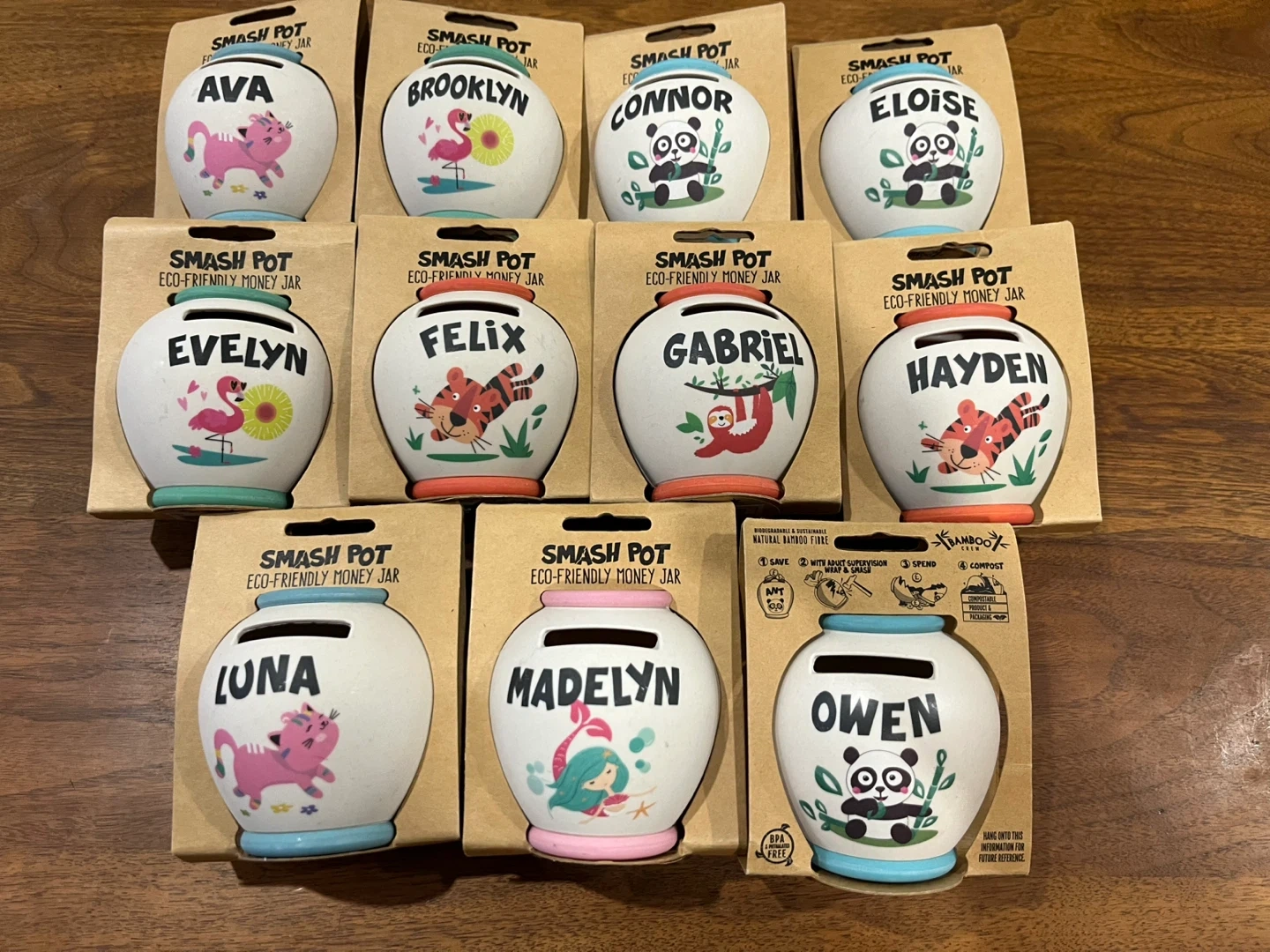 Bamboo money jars with name & animal, great for toddlers and young kids.