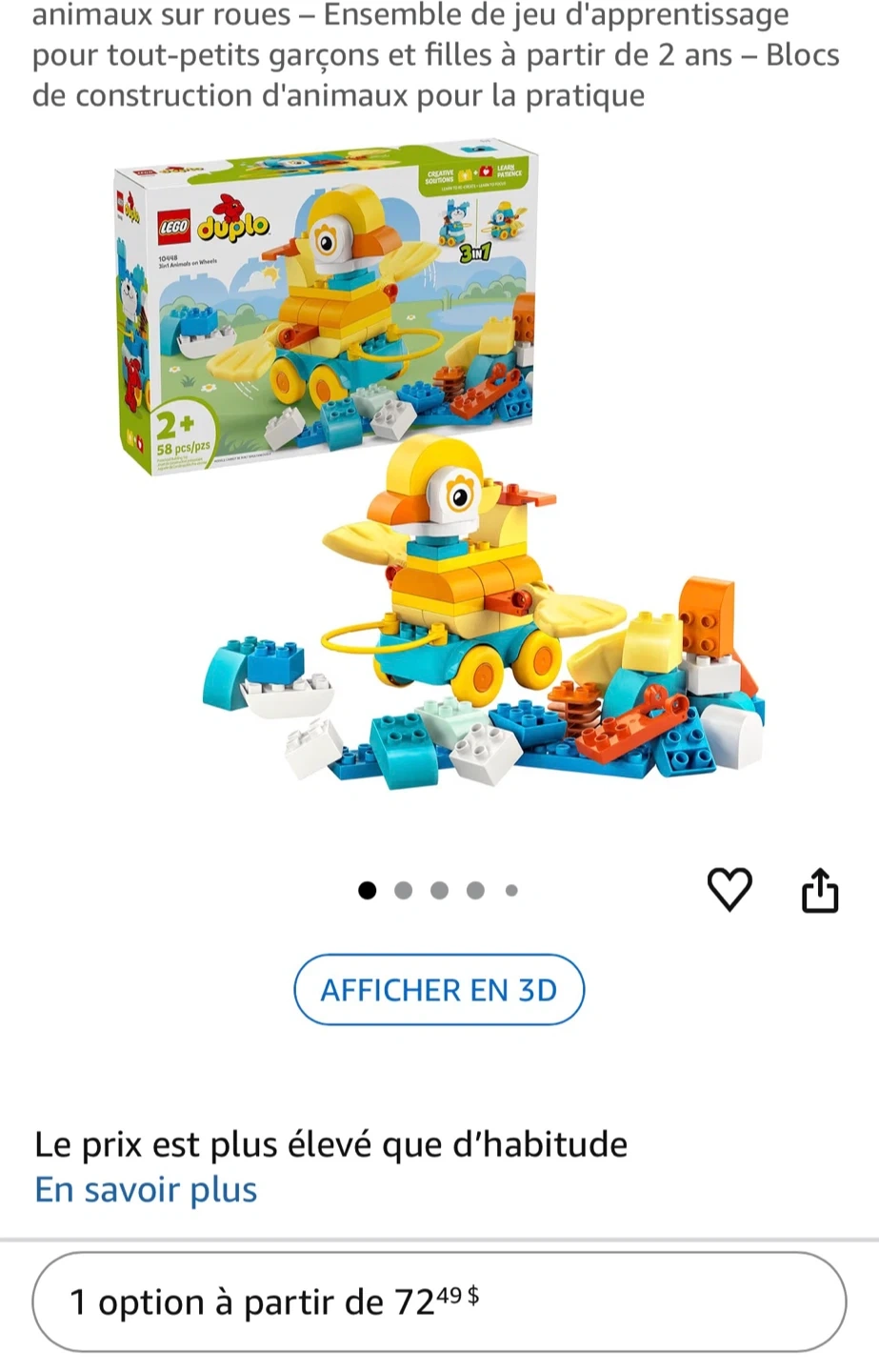 This LEGO Duplo set includes 58 pieces for building 3 different animal creations on wheels. It's designed for ages 2 and up. Encourages creative solutions and learning patience!