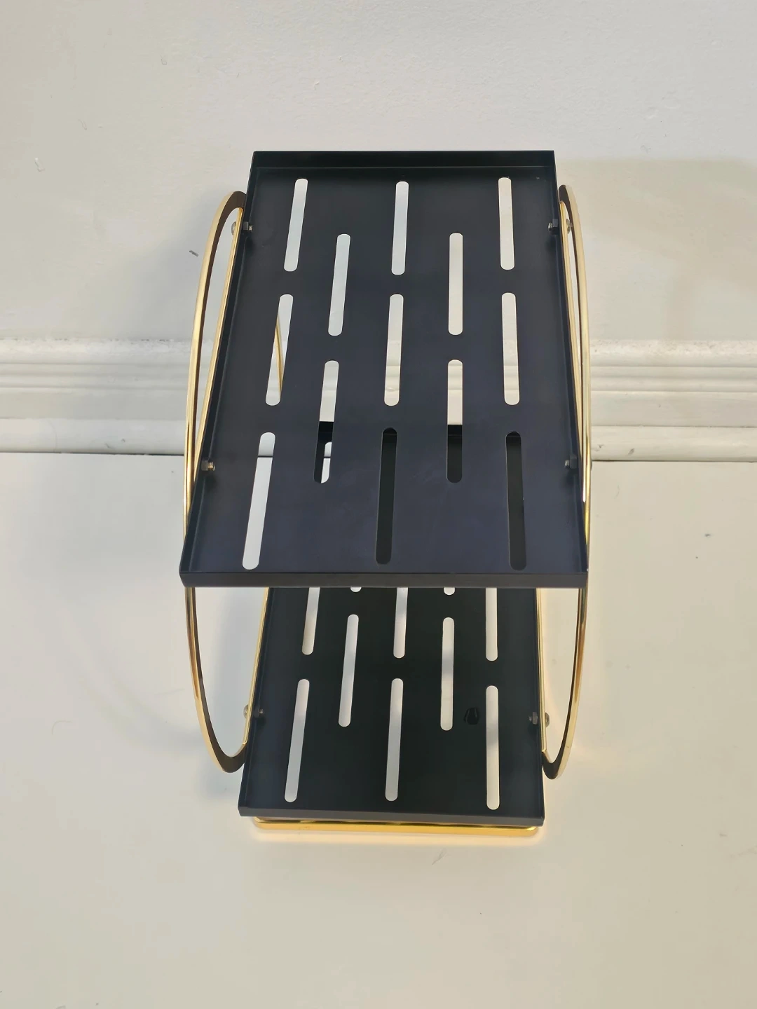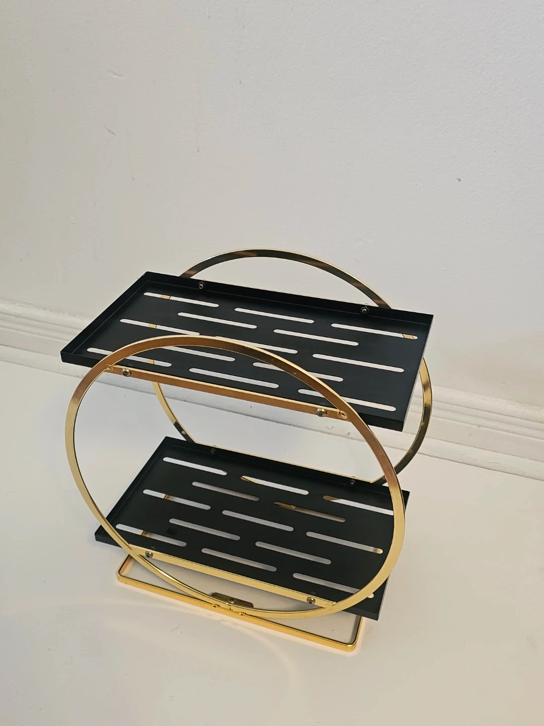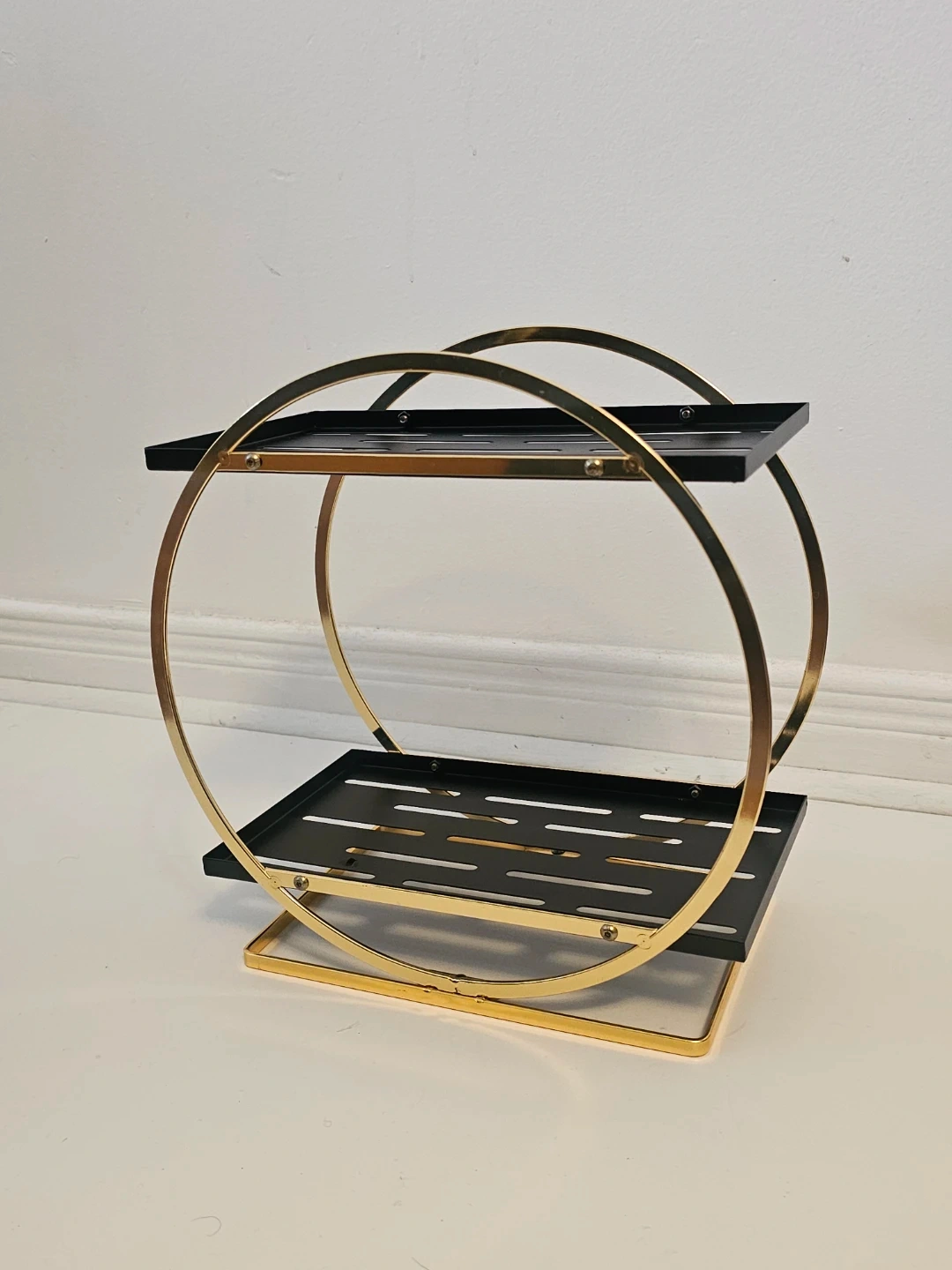 A stylish two-tier display shelf with black metal trays and gold circular accents. It's great for arranging your creams, perfumes and makeups.. Metal construction.
