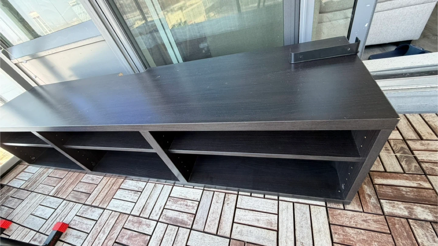 This black entertainment unit offers multiple shelves for storage or display. It's a versatile piece for your living room or media space. The unit is made of particleboard with a dark finish.