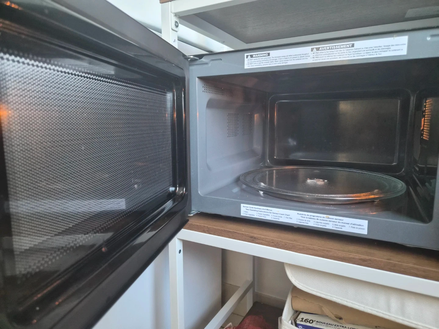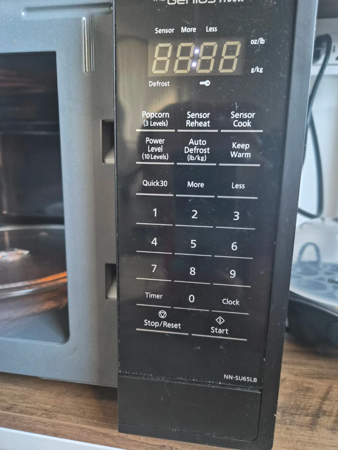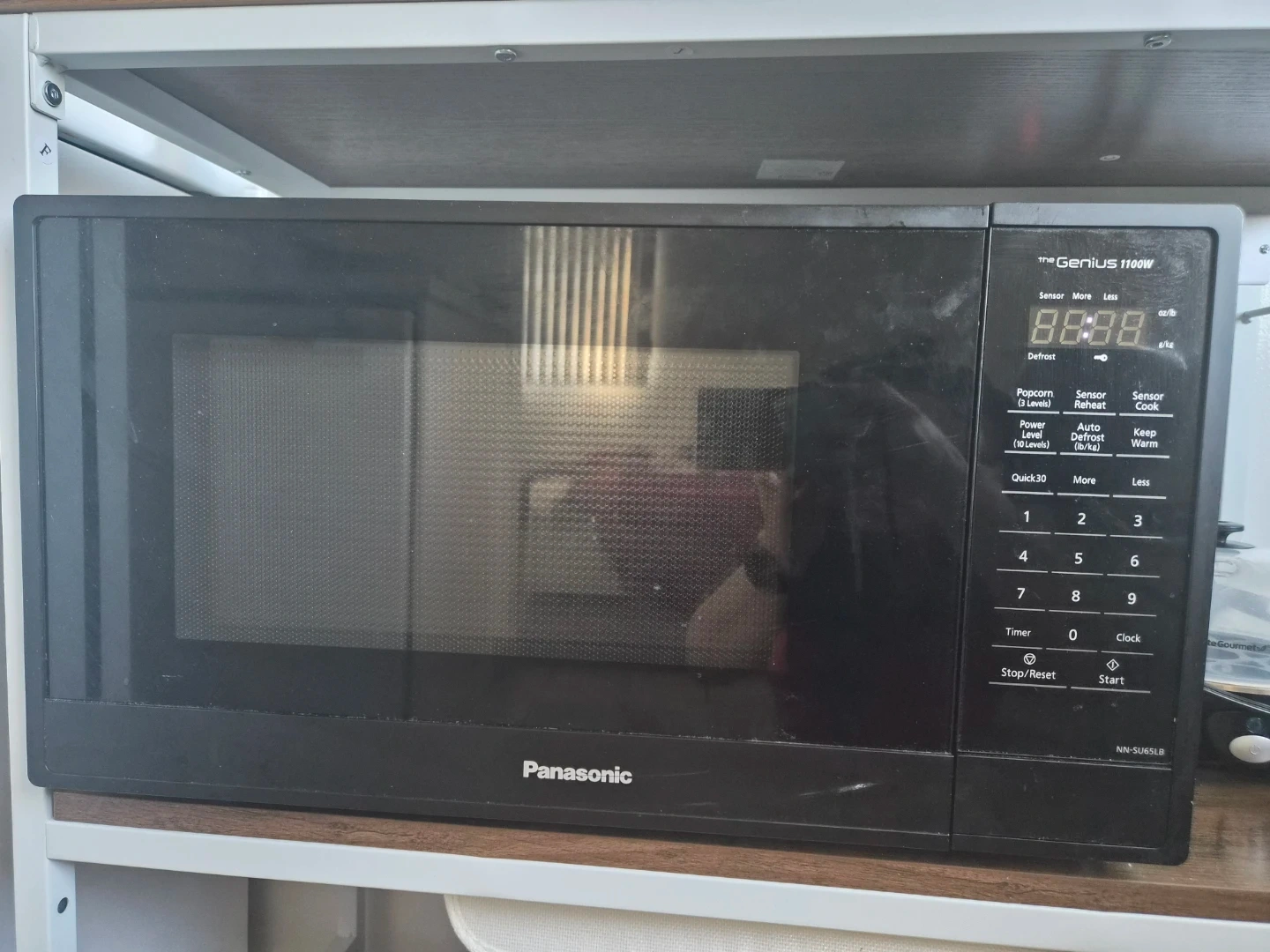 Panasonic microwave oven, model NN-SU65LB. It's a countertop model with 1100W power. Features include popcorn, sensor reheat, auto-defrost, and power level settings. Comes with a glass turntable.
