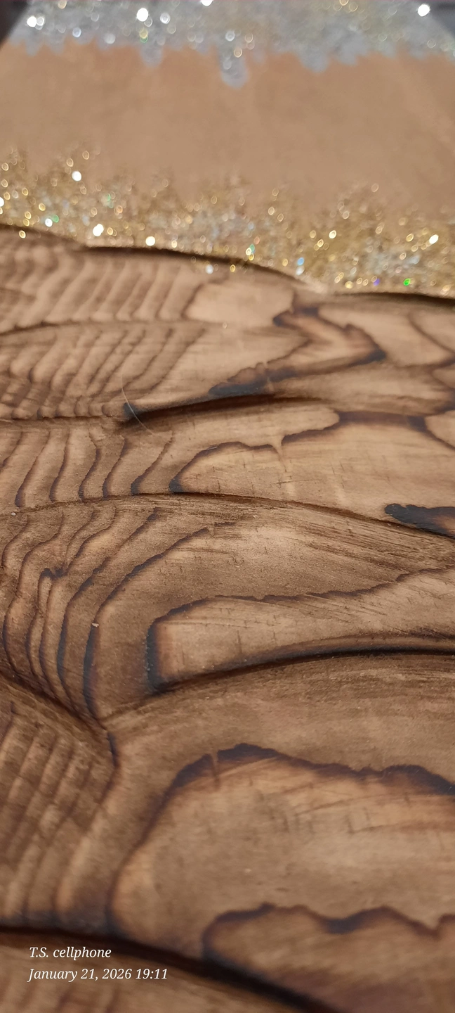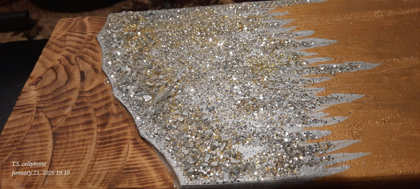 Selling a unique piece of handmade art! It features a combination of natural wood grain and sparkling glitter accents. The piece has a warm, golden hue mixed with silver glitter, creating a beautiful contrast. Perfect for adding a touch of sparkle to any room!