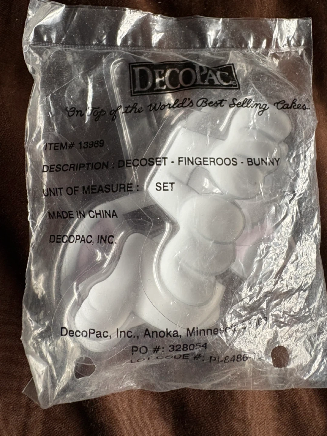 This is a DecoSet cake decorating kit featuring a bunny design. It includes plastic pieces for decorating cakes. The set is made in China.