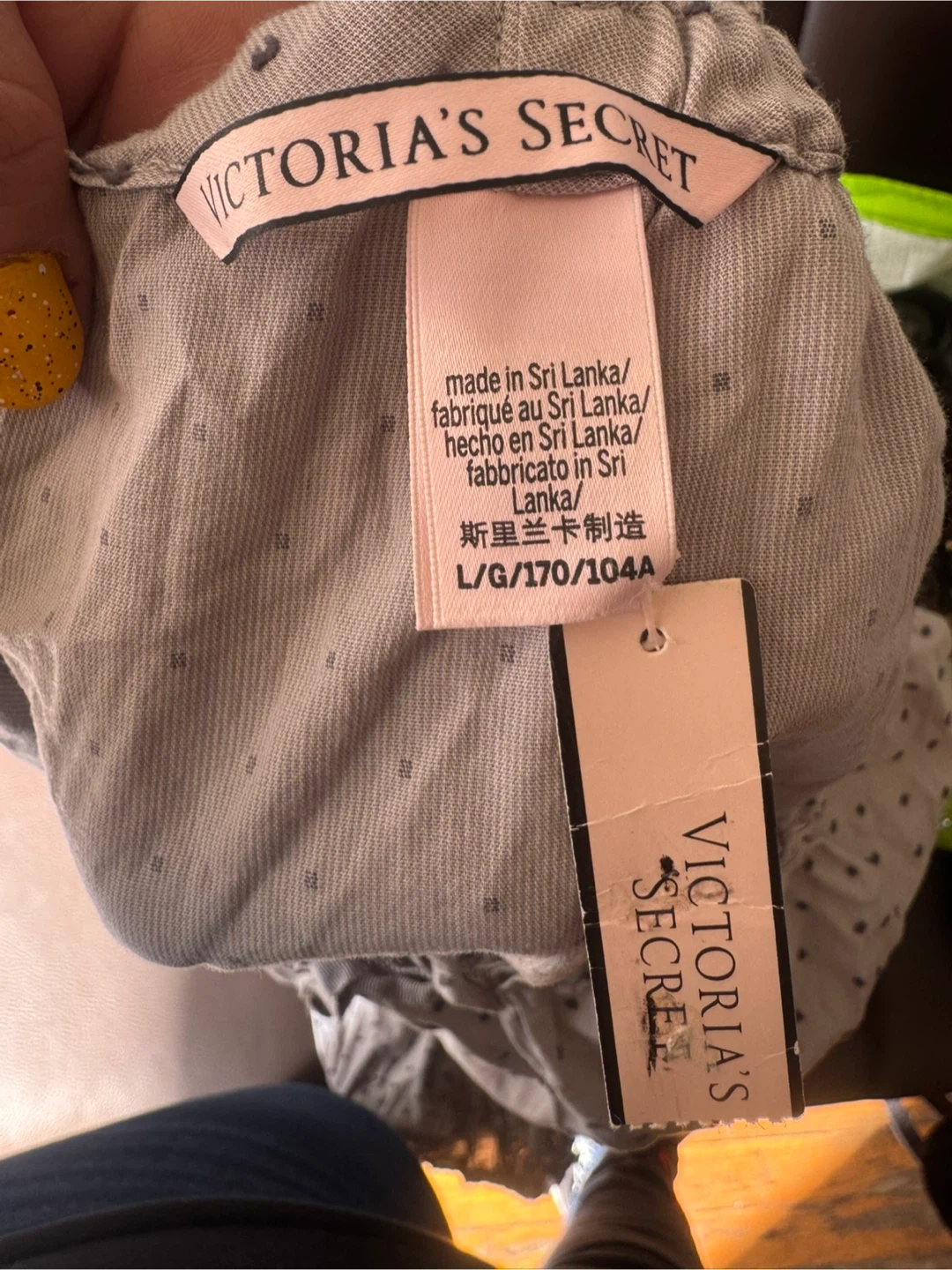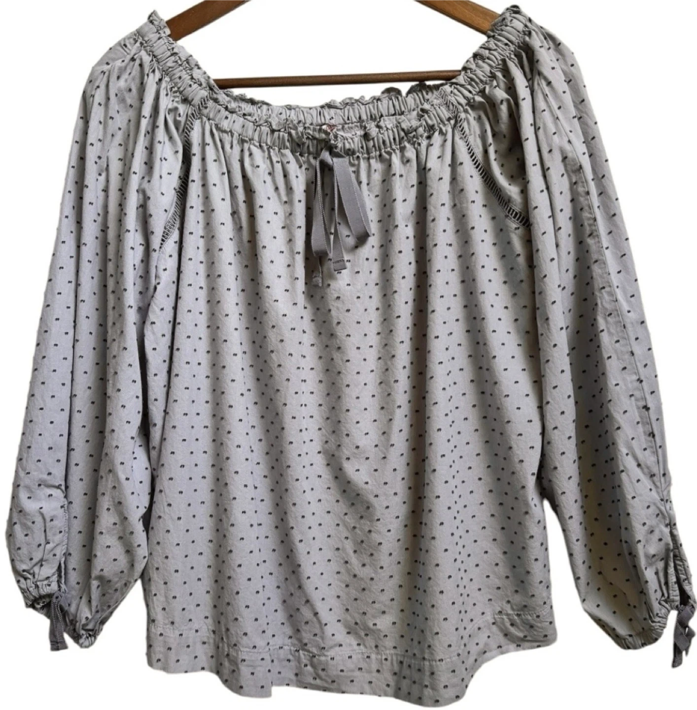 Blusa con hombros descubiertos de Victoria’s Secret. Es un color gris con una pequeña impresión de puntos por todas partes. Cuenta con un escote ahumado y detalle de corbata en el busto ,talla L. $7