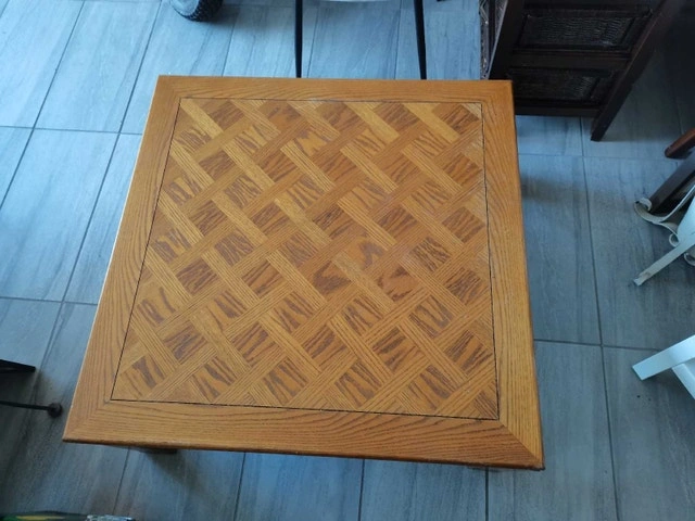 This square oak coffee table, measuring 36" x 36" x 15.5", is a beautiful addition to any living room. It's a used item and shows signs of wear, but it's still sturdy and has a lot of character. It is a great place to put books and have your coffee. The wood grain pattern is beautiful and adds a touch of elegance to any space. * Dimensions: 36" x 36" x 15.5" * Material: Oak
