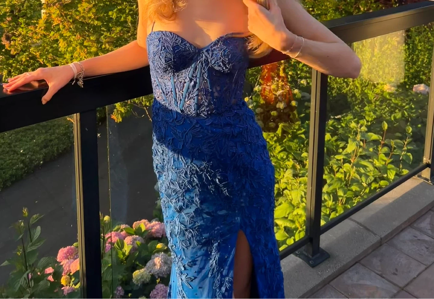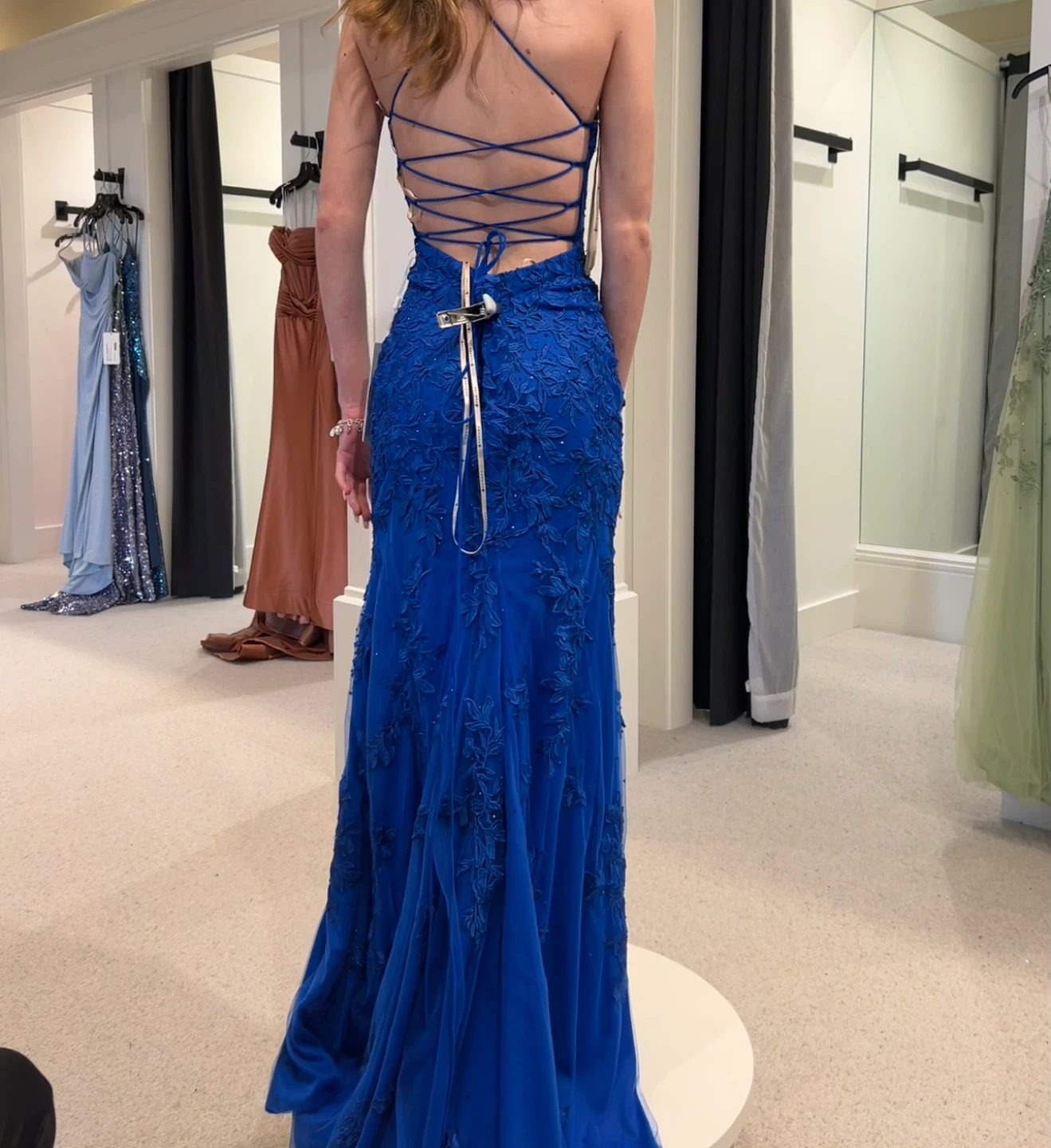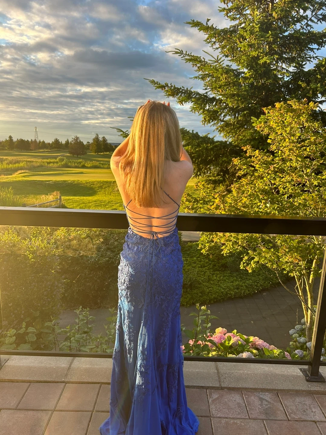 Stunning royal blue floor-length prom dress. It features intricate lace detailing and a flattering criss-cross back. A high slit adds an elegant touch. Perfect for galas and formal events!