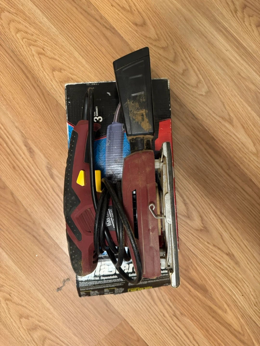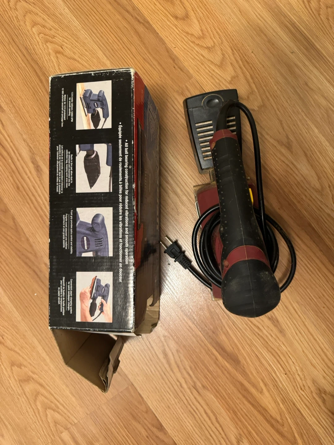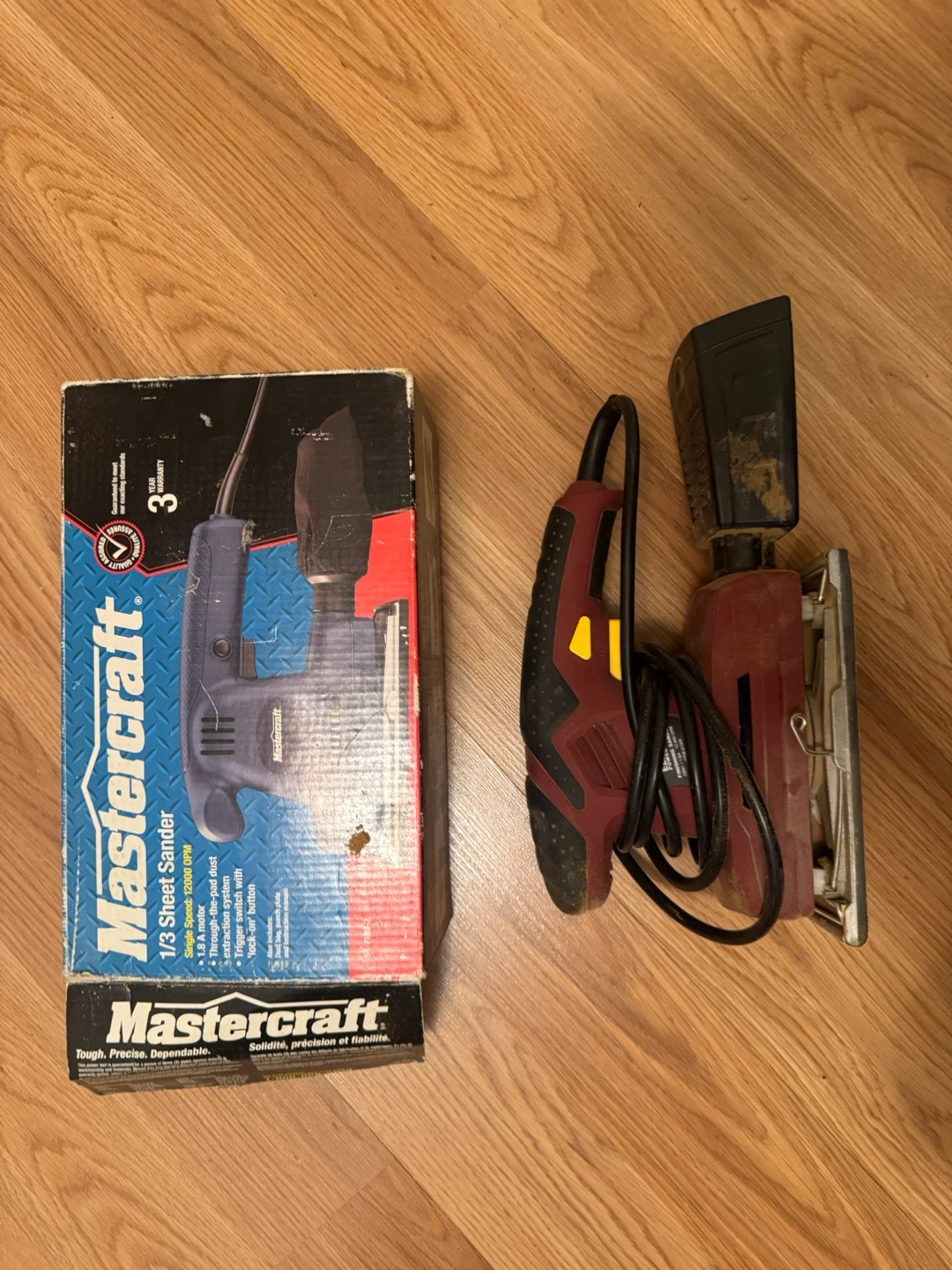 This Mastercraft 1/3 Sheet Sander comes with its original box. It's designed for reduced vibration and smooth operation. Corded electric power source.