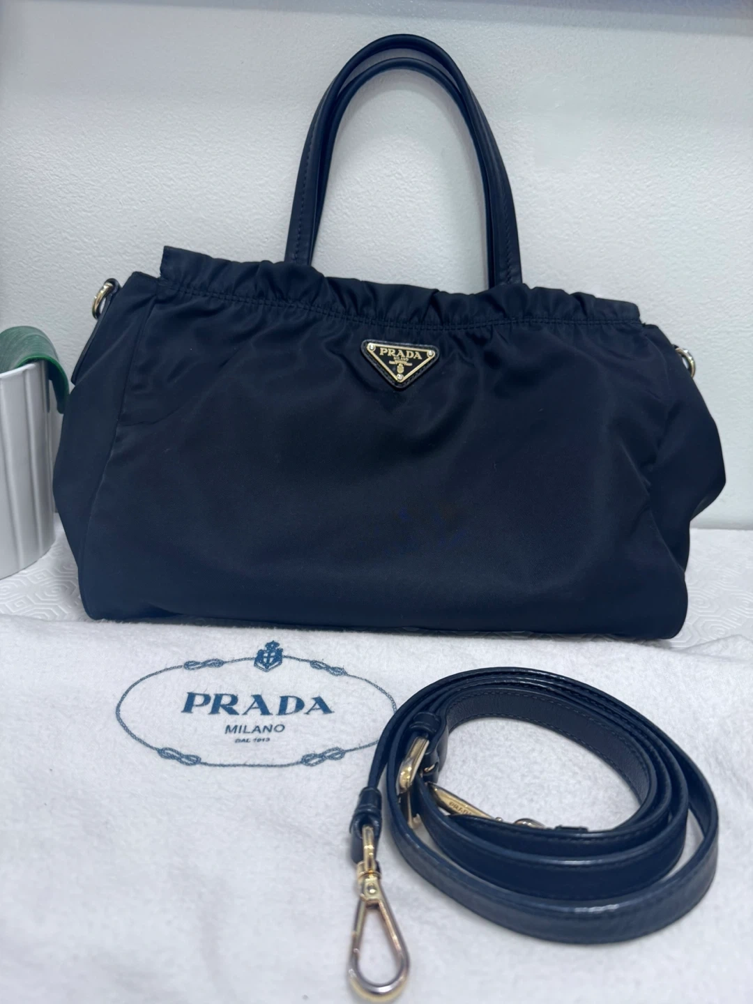 This Prada tote bag is made from black nylon with gathered detailing. It features leather handles and a detachable shoulder strap. The interior has a zippered pocket and two slip pockets. Includes dust bag.
