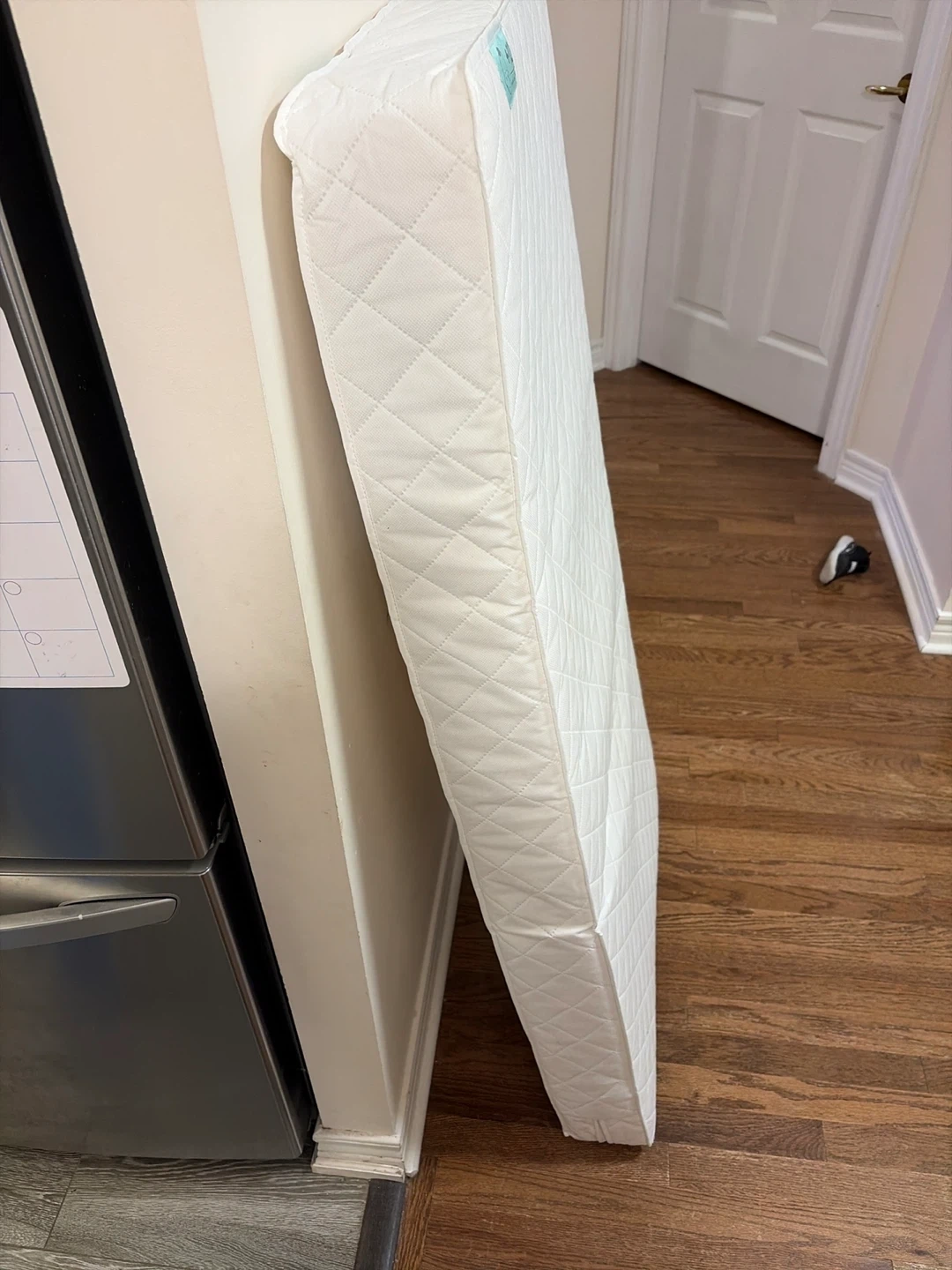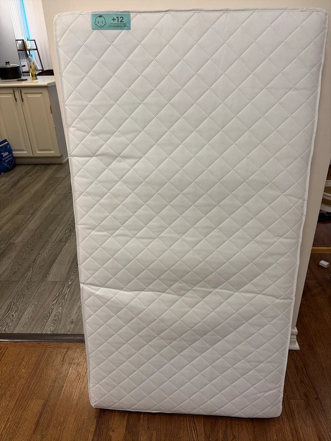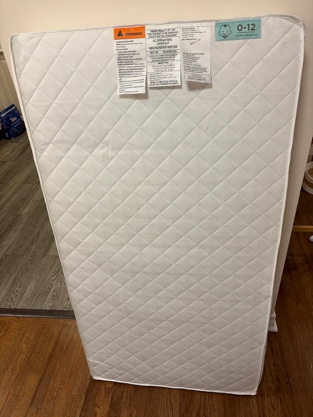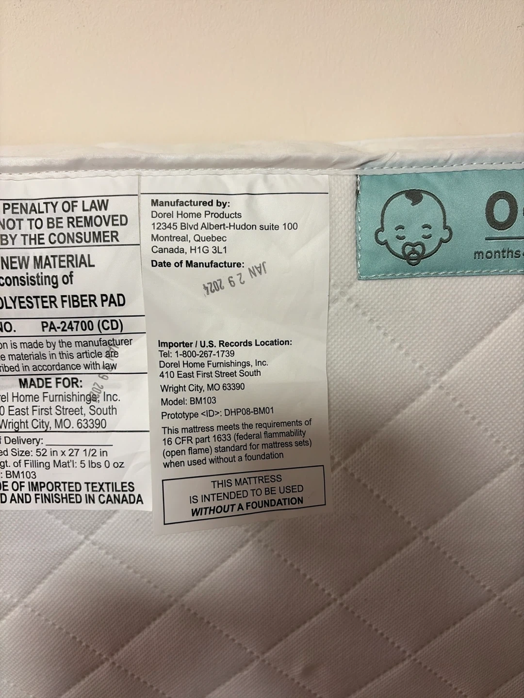 This Dorel Home crib mattress is made of a 100% polyester fiber pad. It measures 52 inches long by 27 inches wide by 4.5 inches deep. The date of manufacture is January 29, 2024.