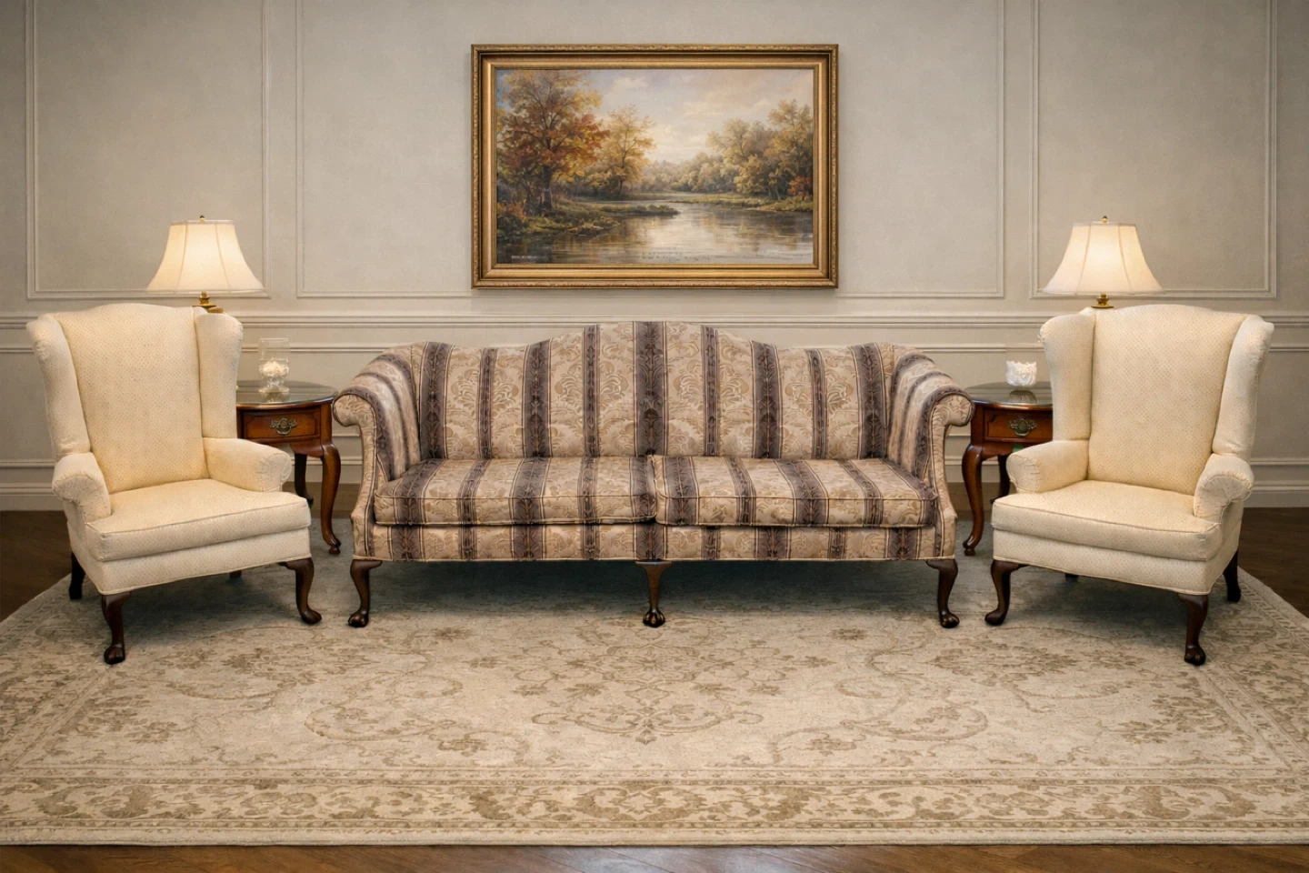 Classic striped sofa paired with two cream upholstered wingback chairs. Upholstery features a subtle patterned damask on the sofa and a textured weave on the chairs. Wooden legs complete the traditional look. They're suitable for a living room or study.
