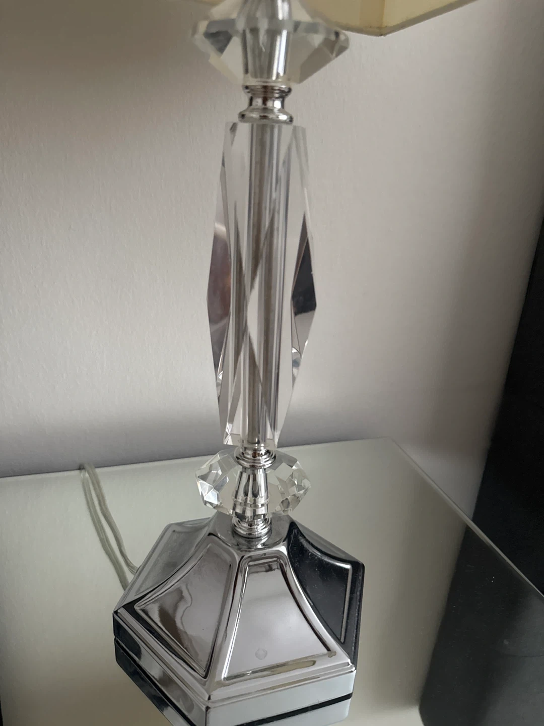 Elegant table lamp with a sparkling crystal and chrome base. It features a classic beige fabric lampshade with trim. Adds a touch of sophistication to any room!
