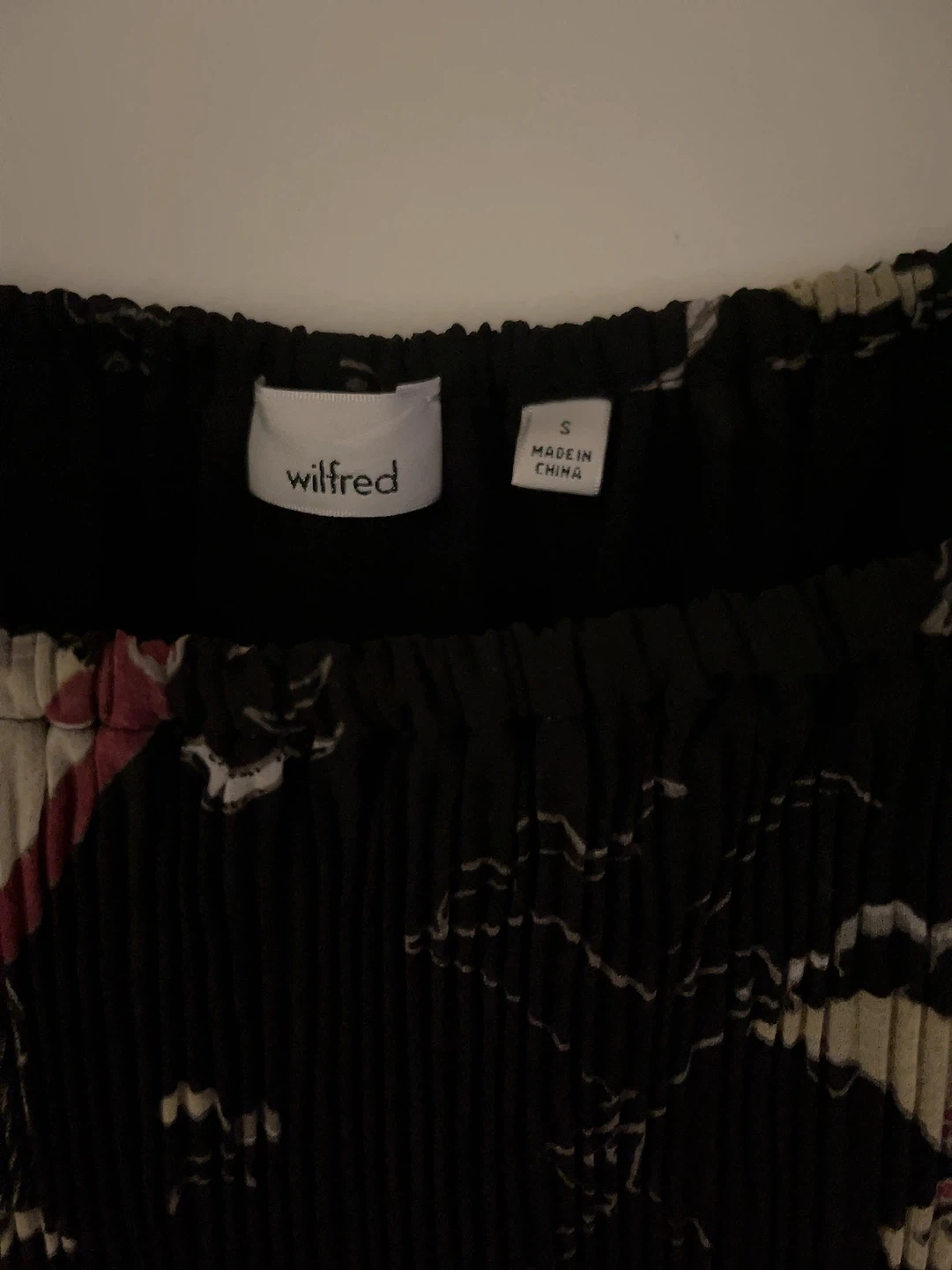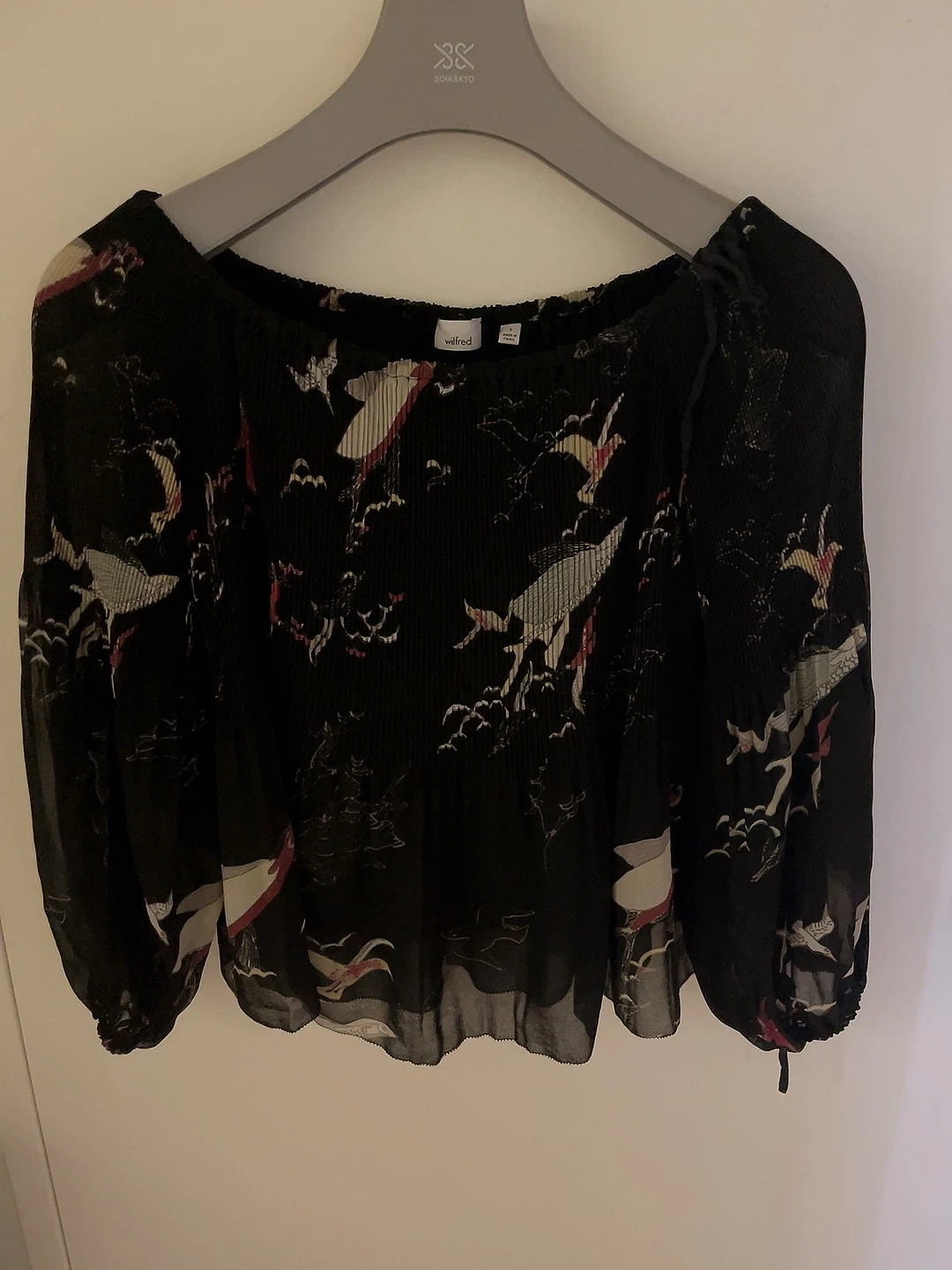 This is a Wilfred black off-the-shoulder blouse. It features a beautiful floral print and a pleated design.