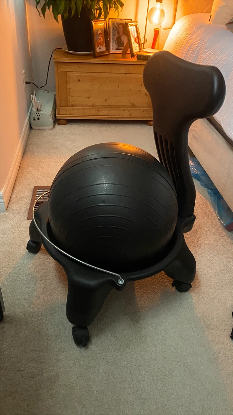 This Gaiam exercise ball chair is black. It's designed to promote active sitting and core engagement. The chair includes the stability ball and the base with wheels.