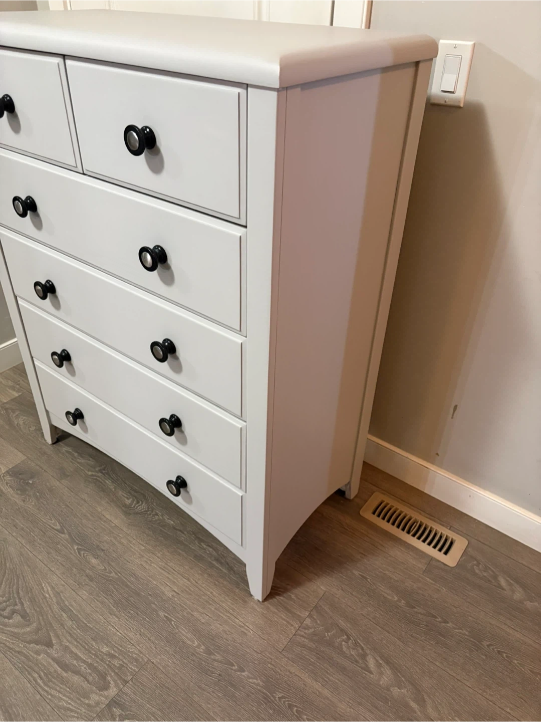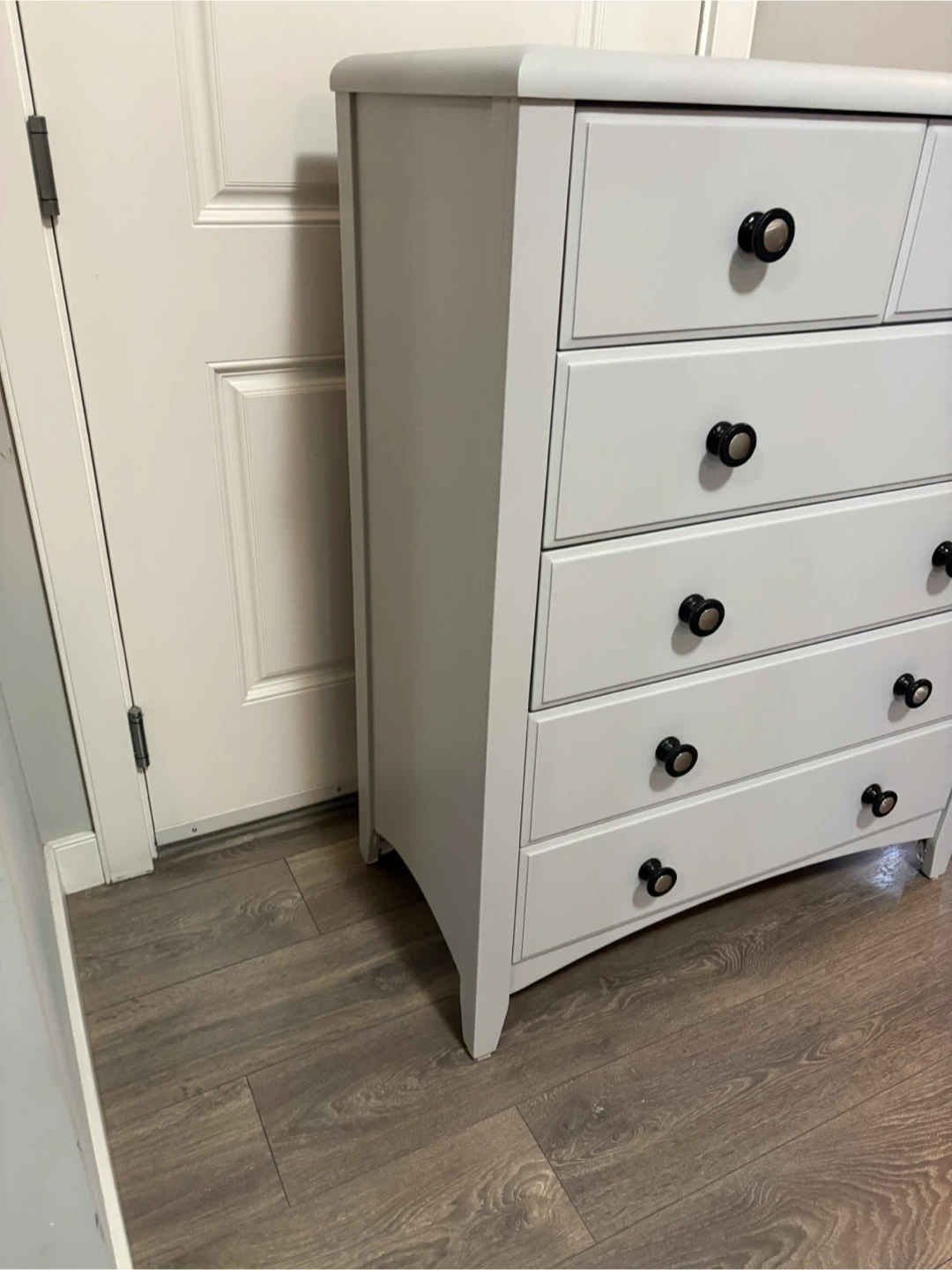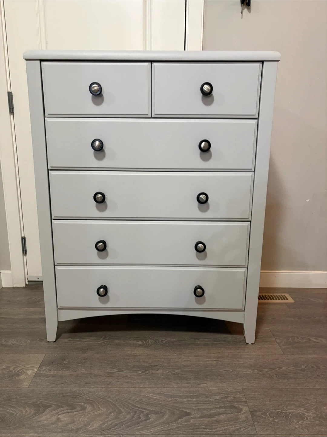 This is refinished grey dresser with six drawers in excellent condition. It’s perfect for adding storage space to any bedroom or living area. The neutral grey colour ensures it will fit seamlessly with any decor style. The drawers are very clean with locking rails.