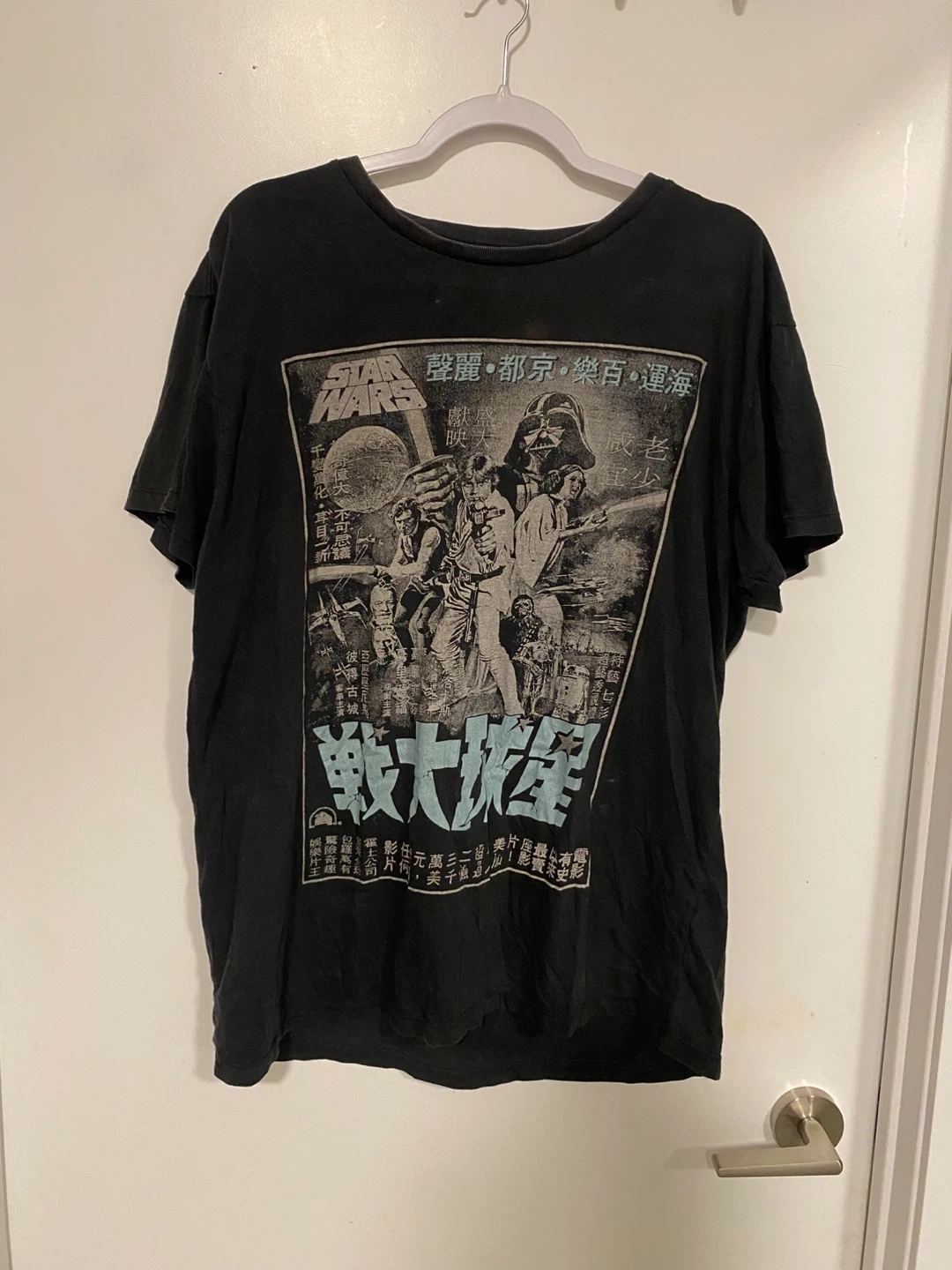 Black graphic t-shirt with a vintage Star Wars movie poster design. It's made of 100% cotton and was made in Thailand. This shirt is great for any Star Wars fan!