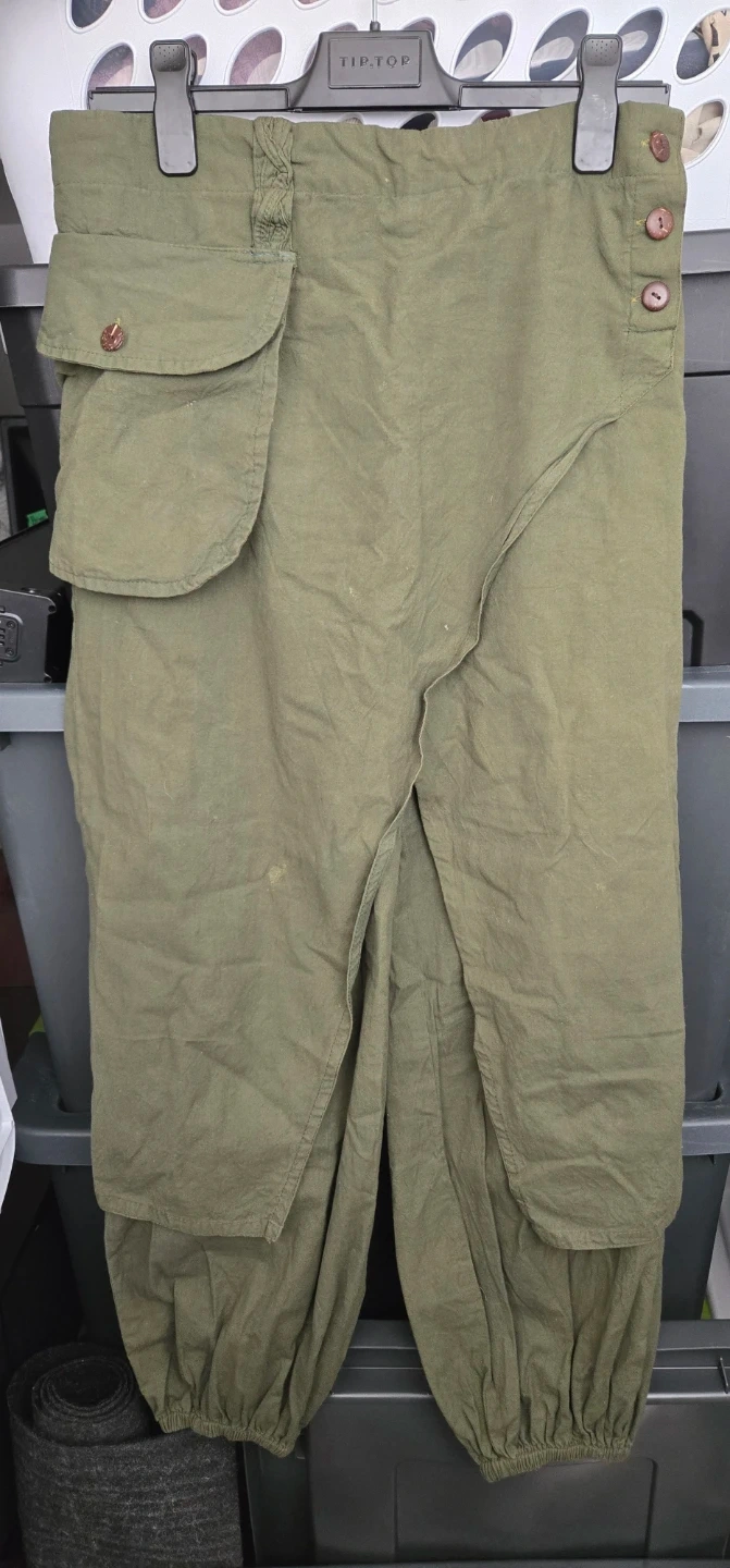 These olive green hippie pants feature a unique wrap-around design with multiple pockets. They're made from 100% cotton material and have an elastic waistband for comfort. Has a side pocket outer pocket and wooden buttons. Great for casual wear or outdoor activities!